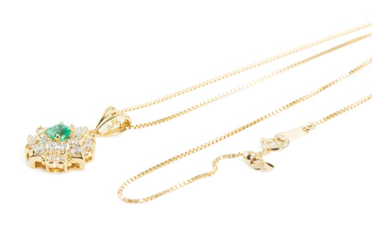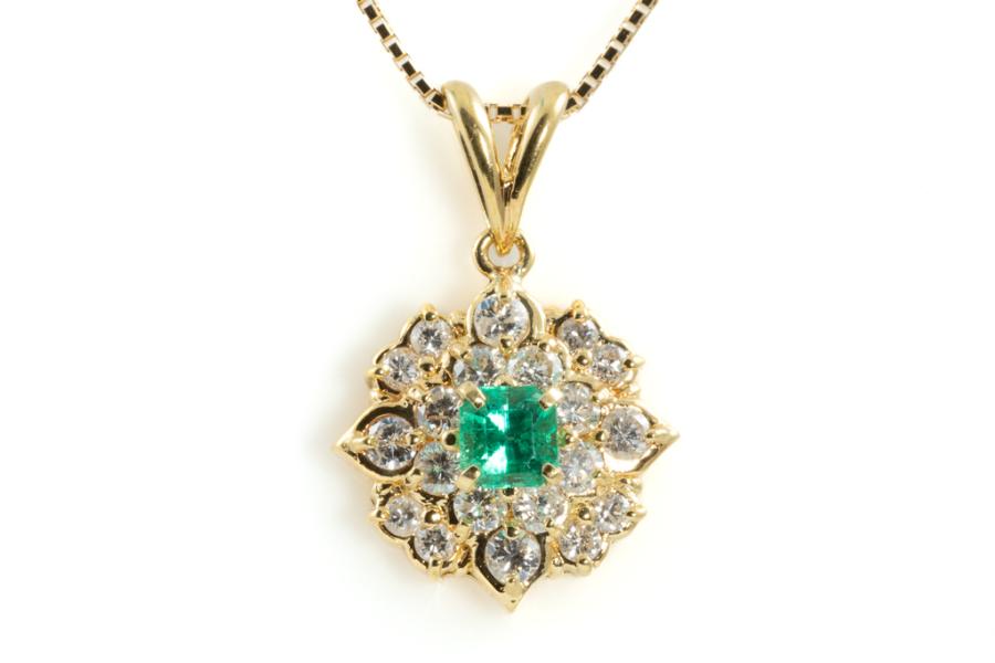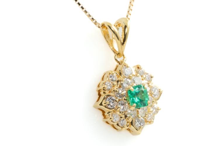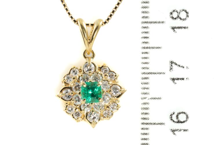 Emerald and Diamond pendant with square cut natural Emerald of 0.32ct and round natural Diamonds totalling 0.68cts (Estimated grading: H-I SI). 18ct yellow gold with 44cm 18ct yellow gold adjustable chain. Weight: 4.9g. (Pre-owned)