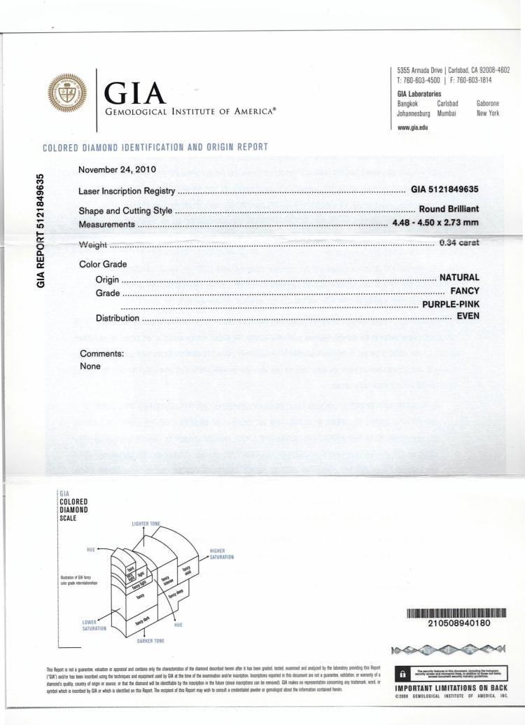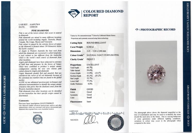 A loose round brilliant cut Natural Diamond of 0.34ct (With GIA Report graded as Natural Fancy Purple-Pink Even # 5121849635 and GSL Report graded as Natural Fancy Purplish Pink P2 #AA69176/4). (As New)