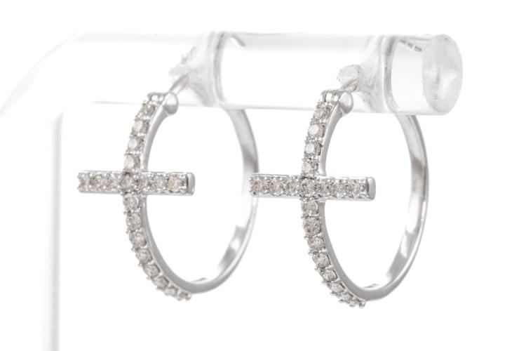 Diamond hoop Cross earrings with 38 round Natural Diamonds totalling 0.36cts (Estimated grading: H-I SI). 14ct white gold. Width: 16.0mm. Length: 18.0mm. Weight: 2g. (New).