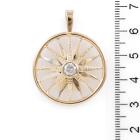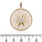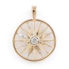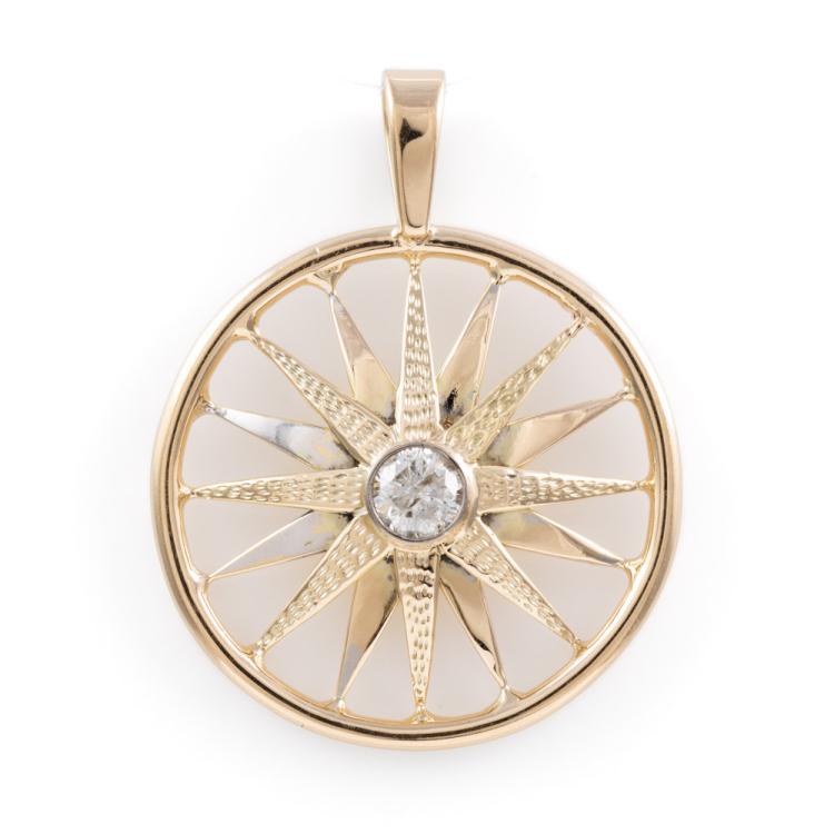 Diamond pendant with a round Natural Diamond of approximately 0.40ct (Estimated grading: H P2). 11ct yellow gold XRF tested (stamped 9ct). Rhodium plating around the diamond and some rhodium on the spokes. No chain provided. Approximate dimension: 38mm (including bale) x 31mm. Weight: 6.5g (Pre-owned)