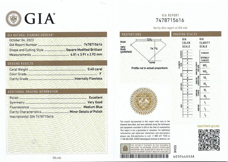 A loose princess cut Natural Diamond of 0.40ct (with GIA summary report graded as F Internally Flawless# 7478715616