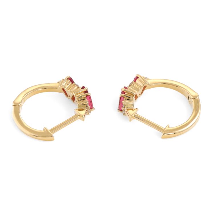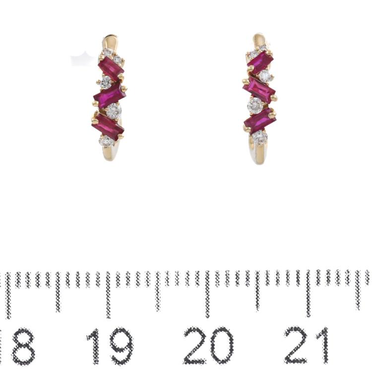 Huggie earrings with baguette cut Natural Rubies totalling 0.41ct and round Natural Diamonds totalling 0.11ct. 18ct yellow gold. Weight: 2.3g (New)