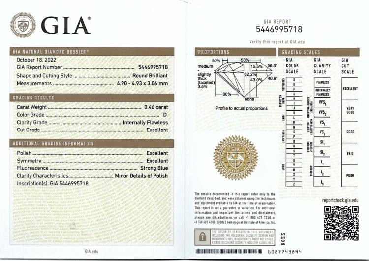 A loose round brilliant cut Natural Diamond of 0.46ct (with GIA report graded as D Internally Flawless # 5446995718). (New)
