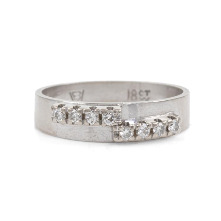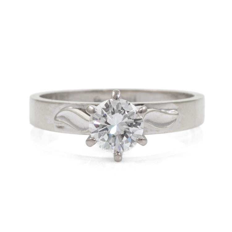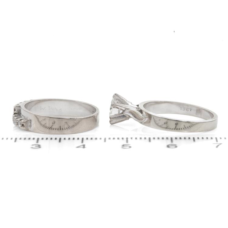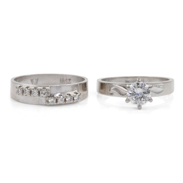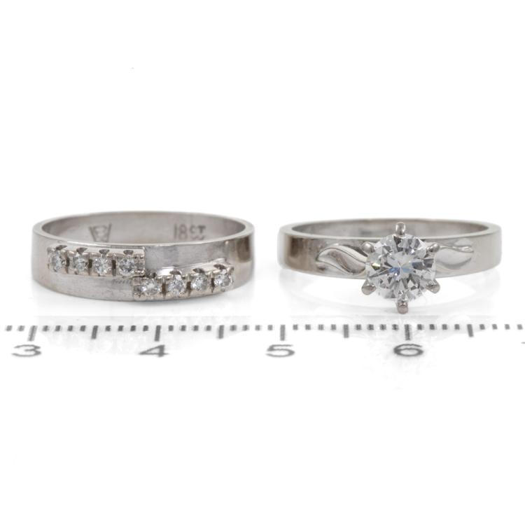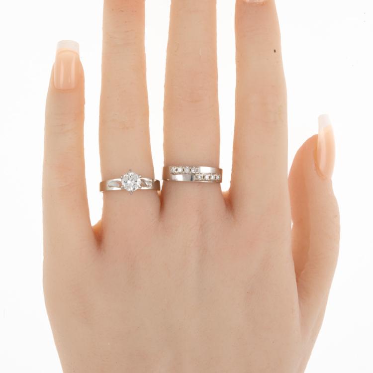 Diamond solitaire ring with a round brilliant cut Natural Diamond of approximately 0.70ct (Estimated grading: G SI). Matching band with 8 round Natural Diamonds totalling approximately 0.12ct. 18ct white gold. Solitaire ring: Band width 2.2mm-3.3mm (Ring size L), 3.5g. Matching band: Band width 3.4mm-4.4mm (Ring size L1/2), 3.6g. (Pre-owned)