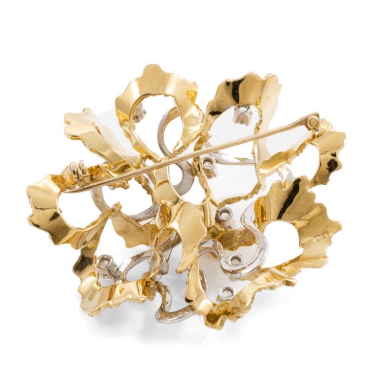 Diamond Brooch with 11 round Natural Diamonds totalling approximately 1.10cts (Estimated grading: H-I SI). 15ct Yellow & white gold - XRF tested, stamped 18ct. Weight: 22.2g. Note - safety chain attached to the pin is broken. (Pre-owned)