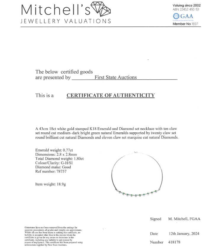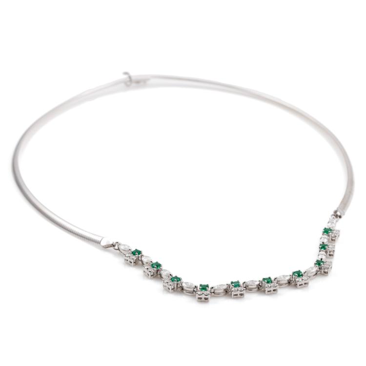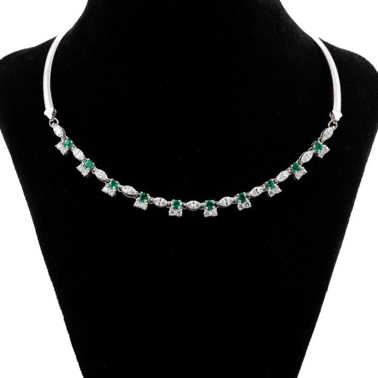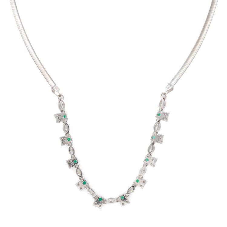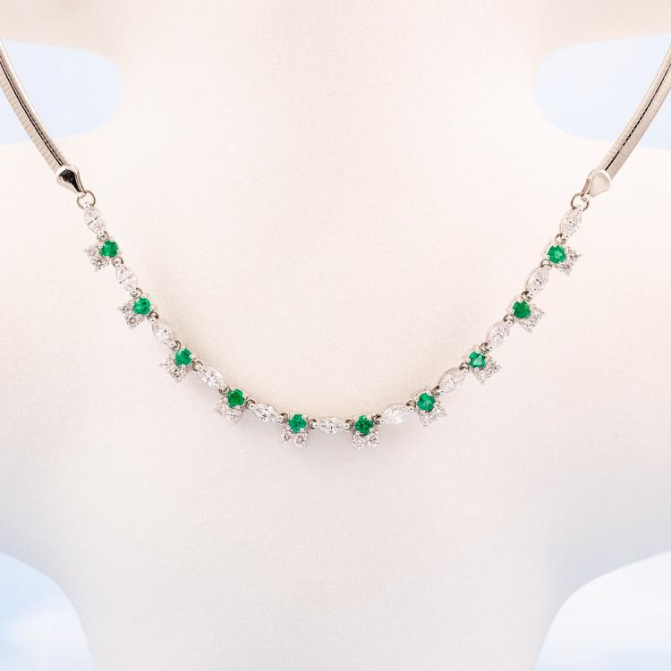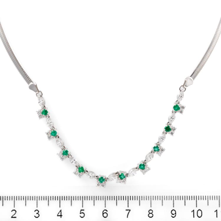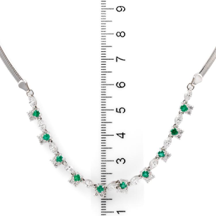 Emerald and Diamond necklace with round Natural Emeralds totalling 0.77ct and round & marquise cut Natural Diamonds totalling 1.80ct (Estimated grading: G-H SI) attached to an 18ct white gold Omega chain. Length: 43cm. Weight: 18.9g. With Certificate #418178. (Pre-owned)
