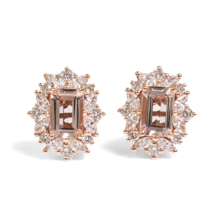 Morganite and Diamond earrings with emerald cut Natural Morganite totalling 0.87cts and Natural marquise cut and round Diamonds totalling 0.63cts (Estimated grading: H SI). 14ct rose gold. Weight: 2.5g. (New)