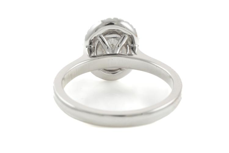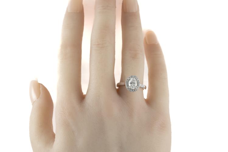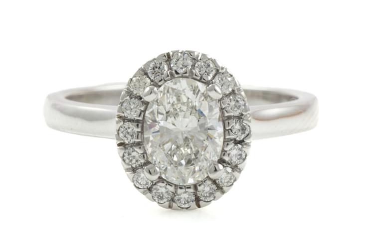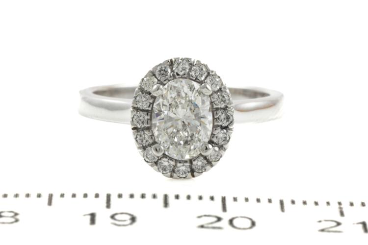 Diamond halo ring with oval shape Natural Diamond of 0.90ct (With GIA summary report graded as E SI1 #2225927090) and surrounding round Natural Diamonds totalling 0.18cts (Estimated grading: G-H VS-SI). 18 white gold ring. Ring size K 3/4. Weight: 4.8g (New)