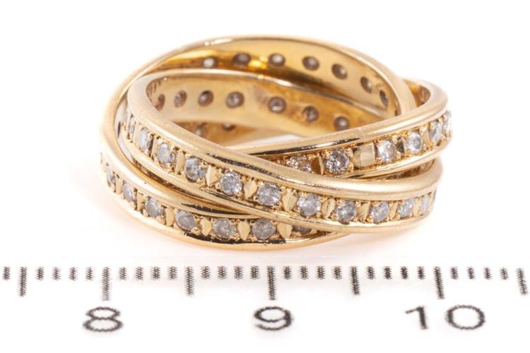 Diamond Russian wedding ring with 3 interlocking bands set with Natural Diamonds totalling 1.02cts (Estimated grading: I-J P1-2). 18ct yellow gold. Ring size J. Weight: 8.6g. (Pre-owned)