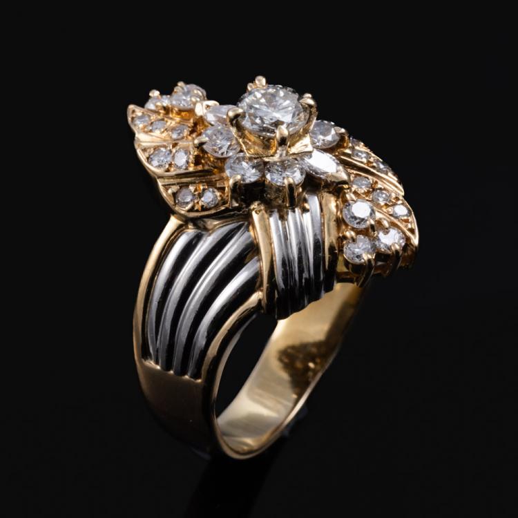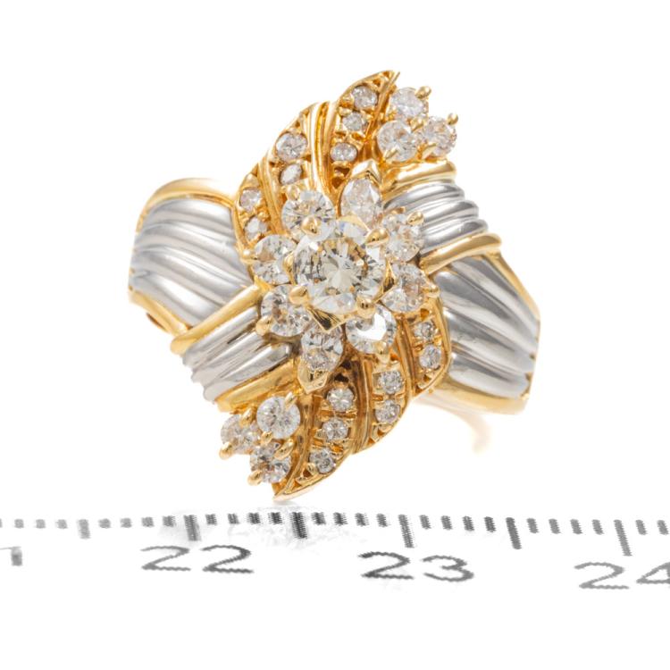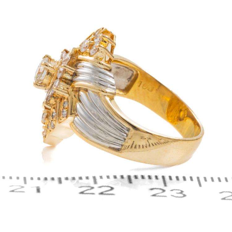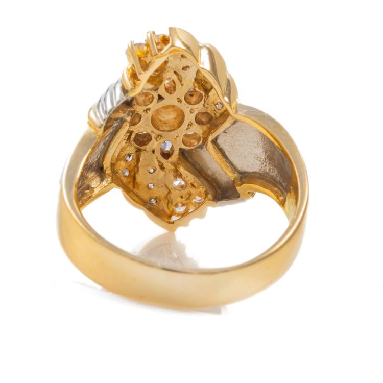 Diamond dress ring with round & marquise cut Natural Diamonds totalling 1.03ct (Estimated grading: H-I SI). Platinum and 18ct yellow gold (stamped: K18 Pt). Ring size O. Band width: 4.1mm-5.6mm. Weight: 8.5g. (Pre-owned)