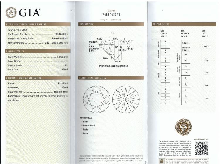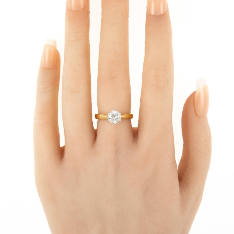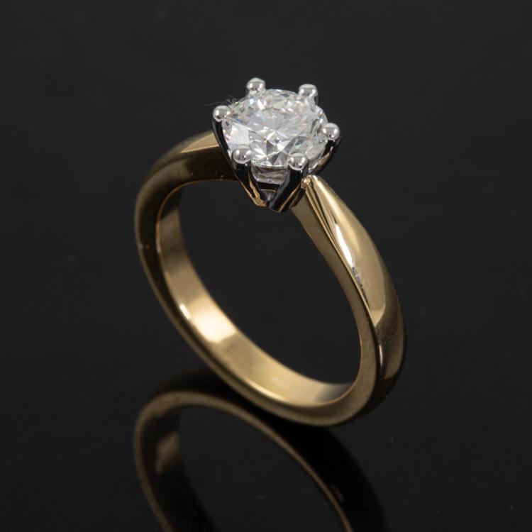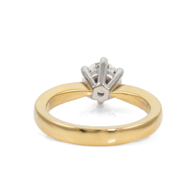 Diamond solitaire ring with round brilliant cut natural Diamond of 1.05ct (with GIA Report graded as E SI1 #7488443375). 18ct white and yellow gold. Ring size: K. Band width: 2.8mm - 1.9mm. Weight: 5.8g. (New)
