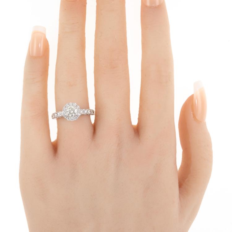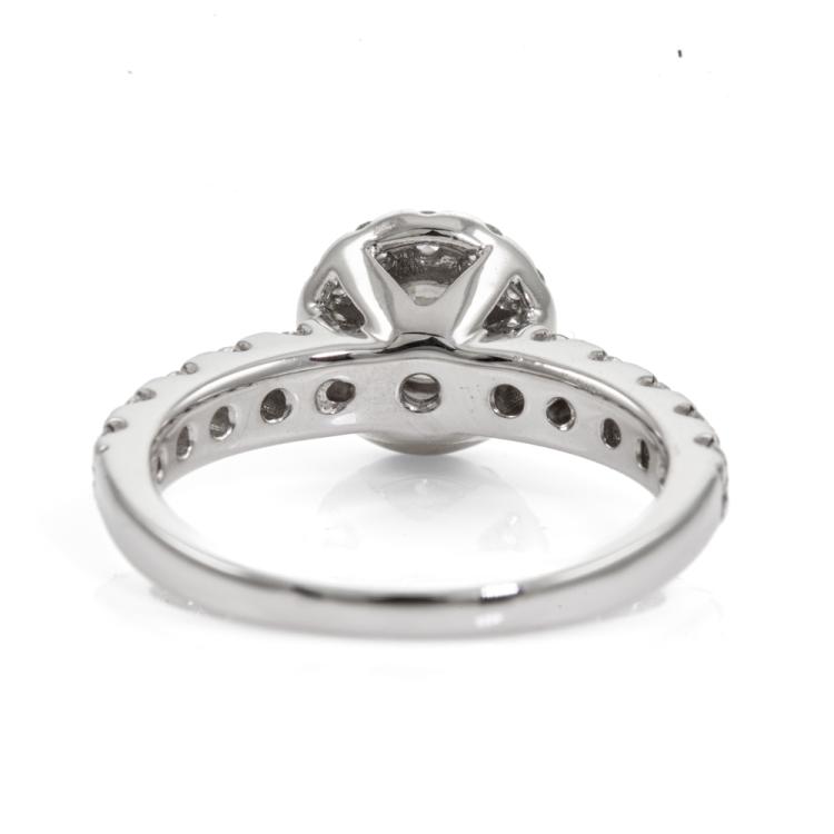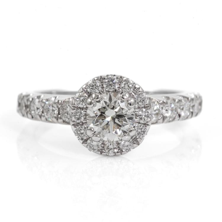 Diamond halo ring with centre round Natural Diamond of 0.52cts (Estimated grading: G VS2) and surrounding round Natural Diamonds totalling 0.57cts (Estimated grading: G-H SI). 18ct white gold. Ring size L. Band width 2.5mm - 1.7mm. Weight: 4.7g. (Pre-owned)