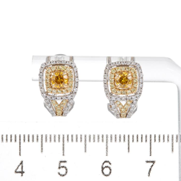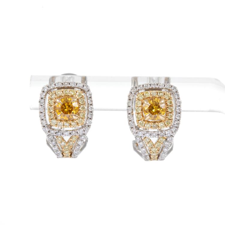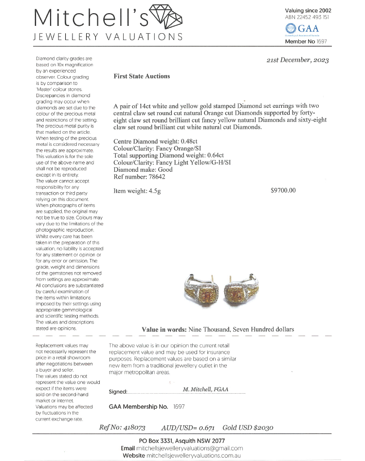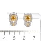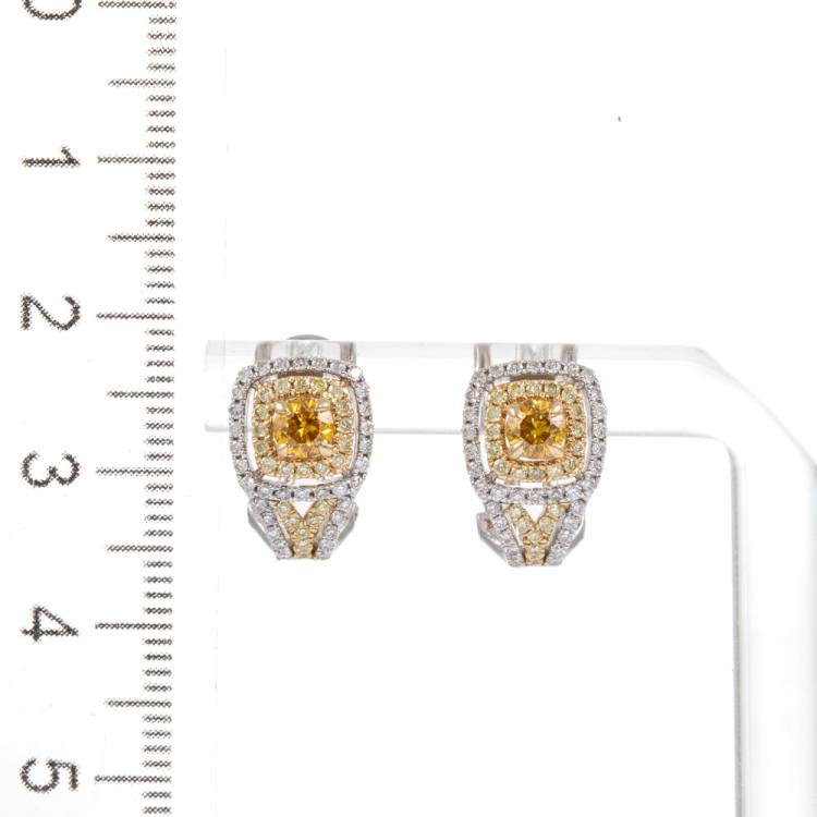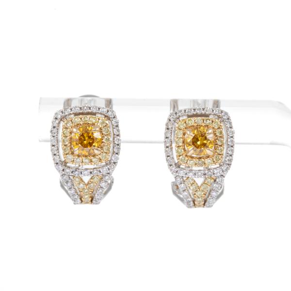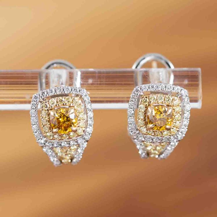 Diamond earrings with centre round orange Natural Diamonds totalling 0.48cts (Estimated grading: Fancy Orange SI, one of orange Diamond with surface reaching natural) and surrounding round white & yellow Natural Diamonds totalling 0.64cts (Estimated grading: Fancy Light Yellow & G-H SI). 14ct white and yellow gold. Weight: 4.5g. With Certificate #418073. (As new).