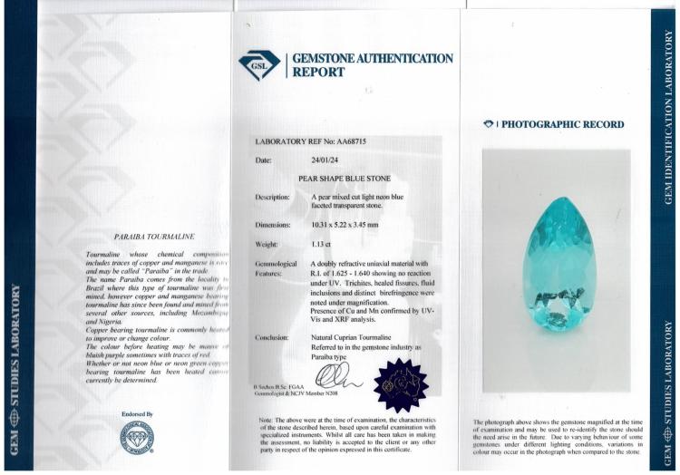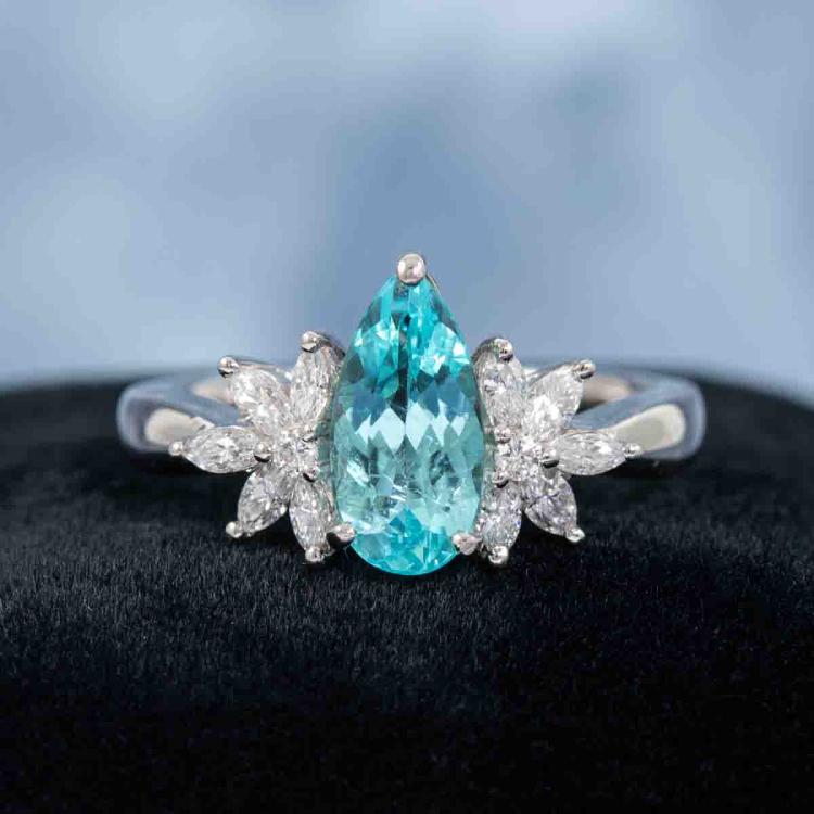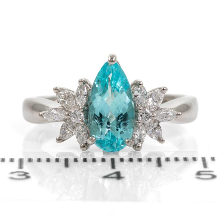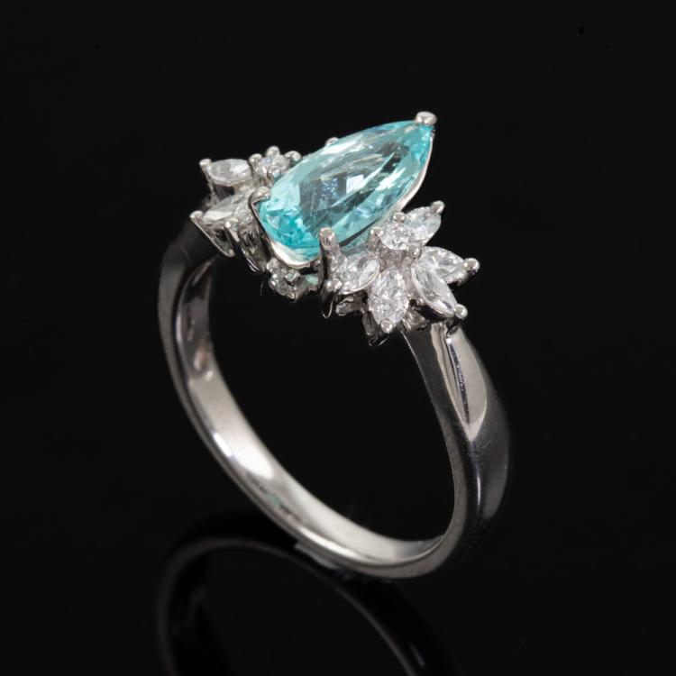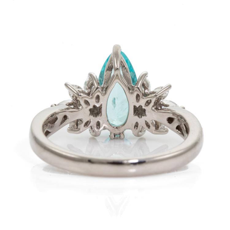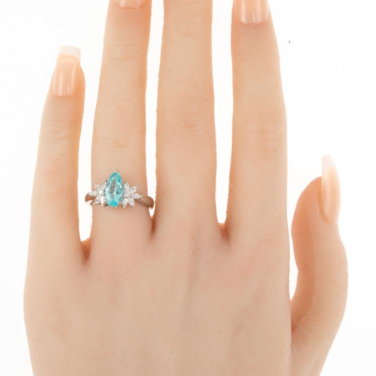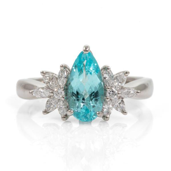 Paraiba and Diamond ring with pear shape light neon blue Natural Paraiba Tourmaline of 1.13ct (With GSL #AA68715) and round & marquise cut Natural Diamonds totalling 0.35cts (Estimated grading: G SI). Platinum 950. Ring size L½. Band width: 2.2mm - 2.1mm. Weight: 5.8g. (Pre-owned)