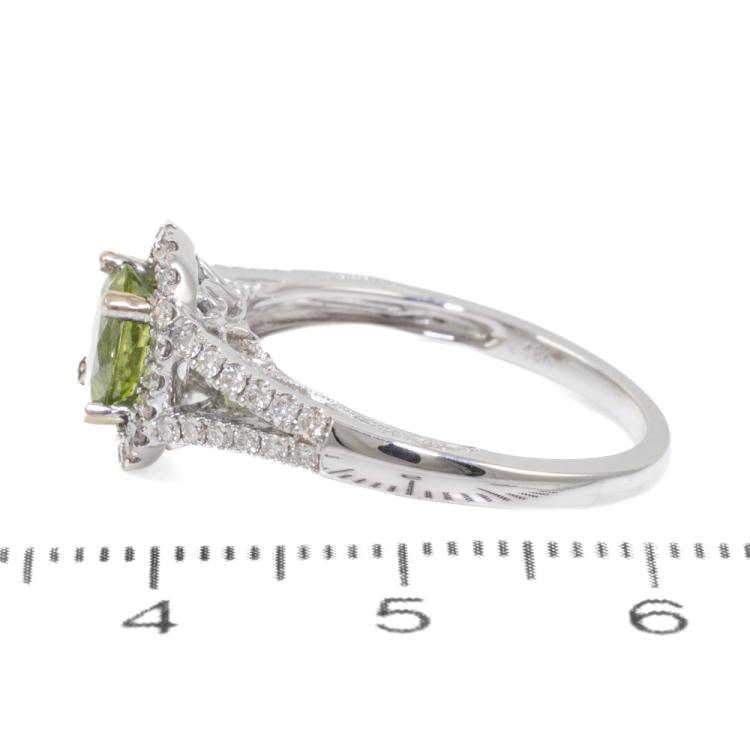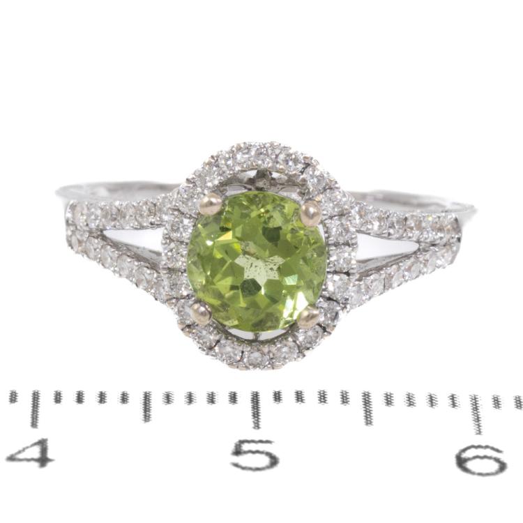 Peridot and Diamond ring with round natural Peridot of 1.15ct and surrounding round natural Diamonds totalling 0.35ct (Estimated grading: H SI). 18ct white gold. Ring size N. Band width: 1.5mm - 2.5mm. Weight: 3.7g. (New)