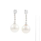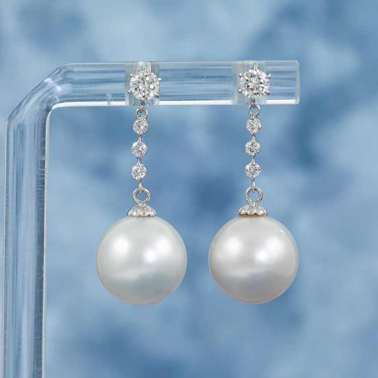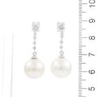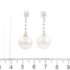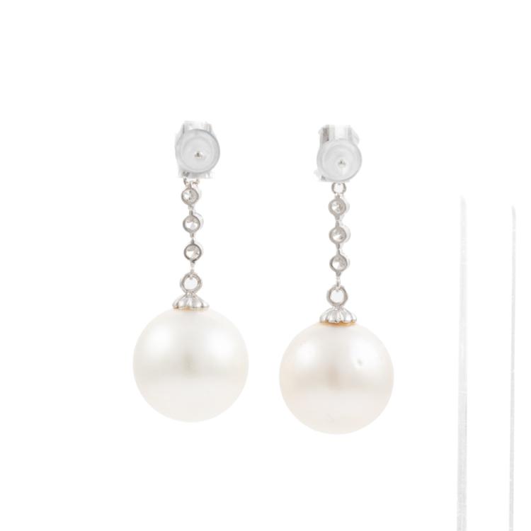 Pearl and Diamond drop earrings with South Sea Pearls of 12.2mm & 12.4mm and round Natural Diamonds totalling 0.43cts (Estimated grading: G SI). Platinum 900 with silicon backs. Weight: 7.2g. (Pre-owned)