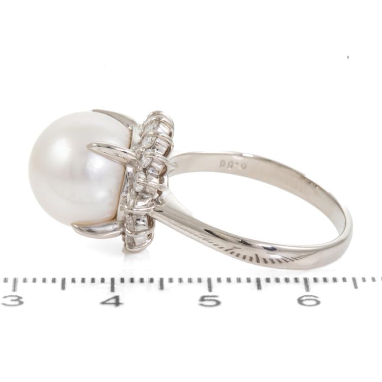 South Sea Pearl and Diamond ring with white South Sea Pearl of 12.4mm and Natural Diamonds totalling 0.66cts (Estimated grading: H-I P1). Platinum 900. Ring size T. Band width: 2.8mm - 2.6mm. Weight: 11.5g. (Pre-owned)