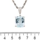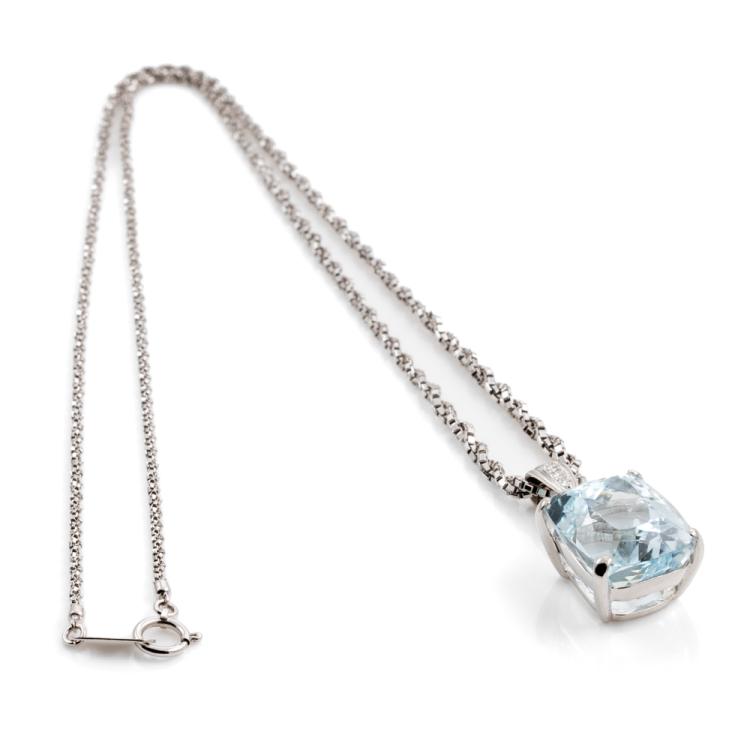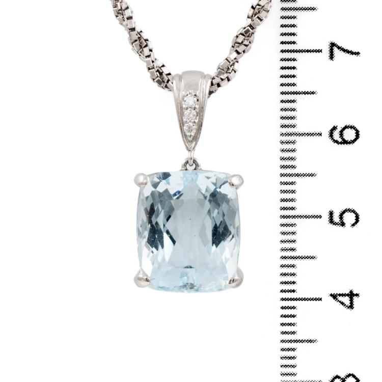 Aquamarine and Diamond pendant with a cushion cut Natural Aquamarine of 12.91ct (note minor wear marks on stone) and 3 round Natural Diamonds totalling 0.07cts. Platinum 900 with platinum 850 45cm chain. Weight: 14.5g. (Pre-owned)