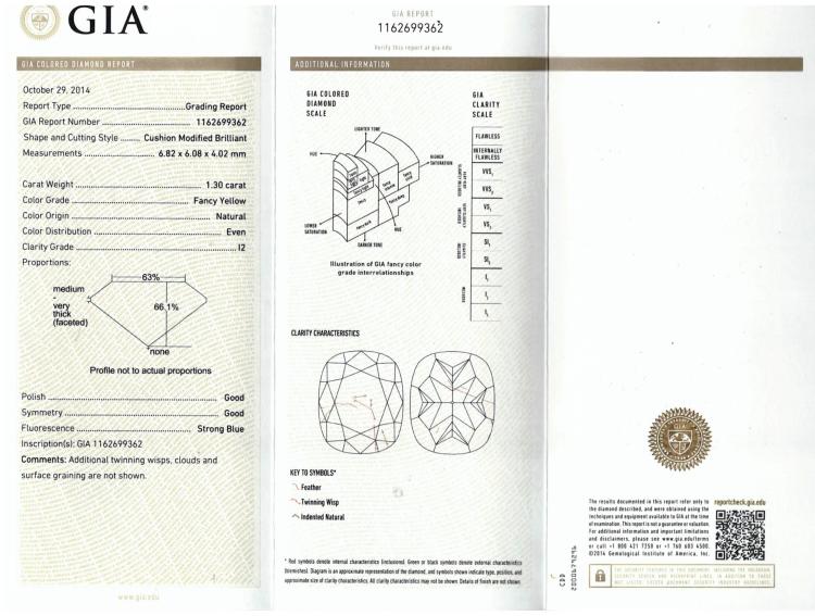A loose cushion cut Natural Diamond of 1.30ct (with GIA report graded as Natural Fancy Yellow Even P2 #1162699362) (New).