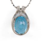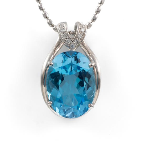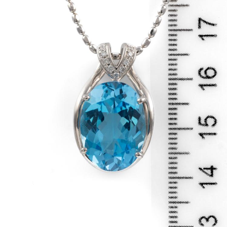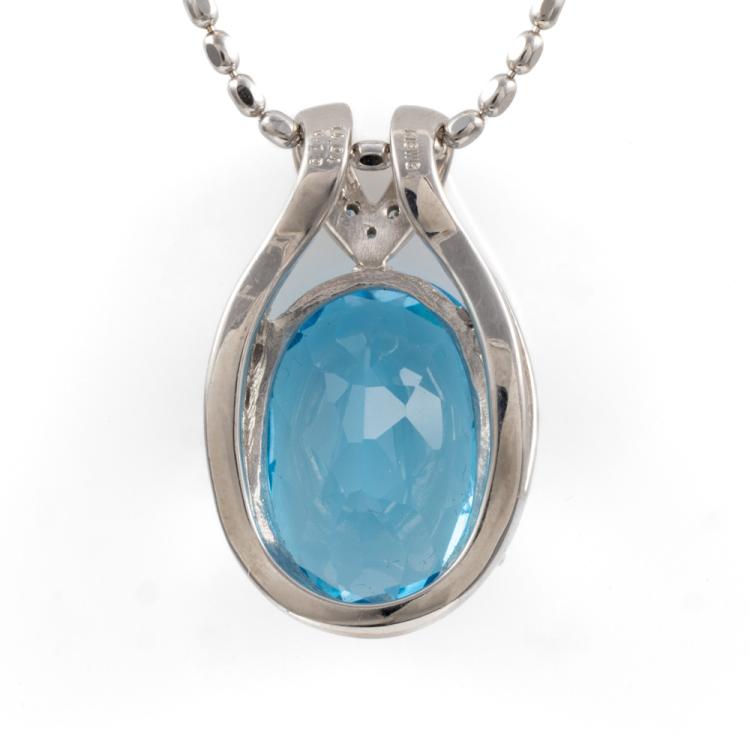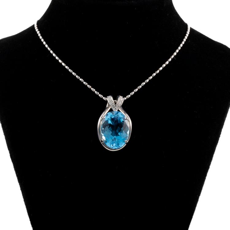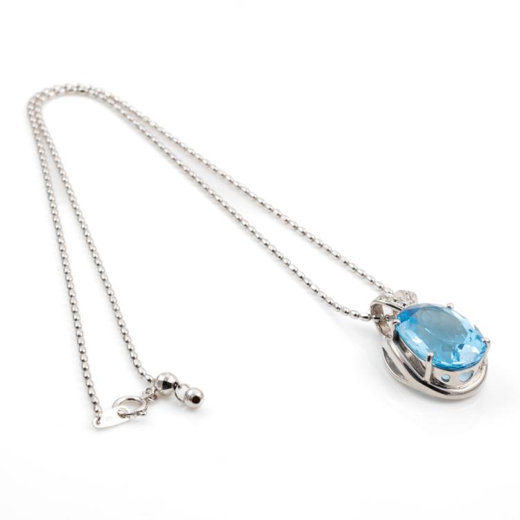 Topaz and Diamond pendant with an oval shape Natural Topaz of 14.04ct and round Natural Diamonds totalling 0.10ct. 18ct white gold with 45cm 18ct white gold adjustable chain. Weight: 13.7g. (Pre-owned)
