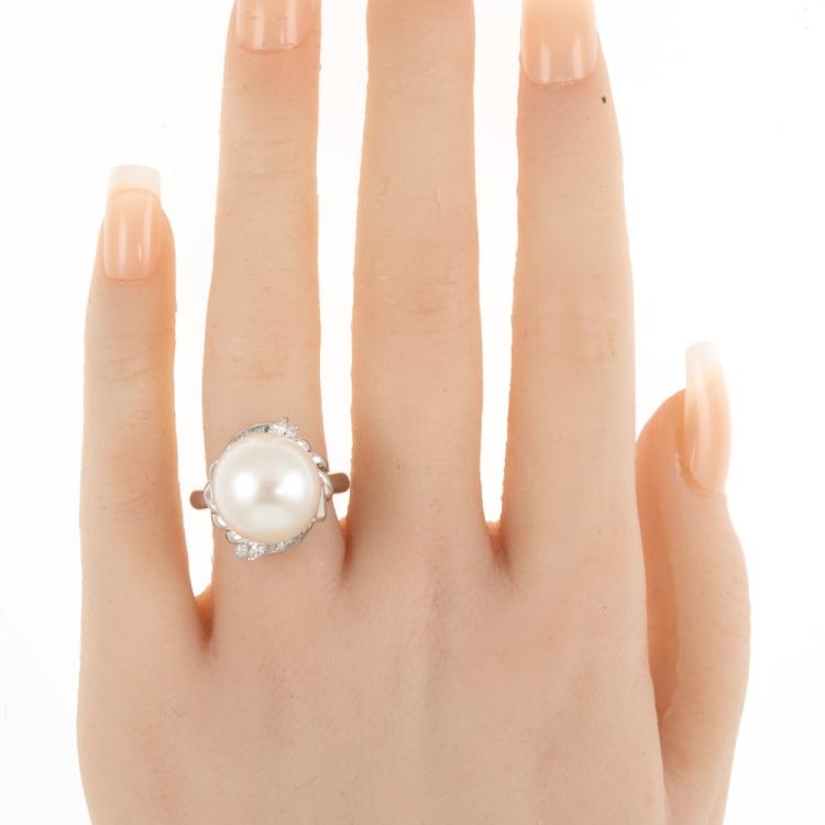 Pearl and Diamond ring with South Sea Pearl of 14.1mm with round, marquise & baguette cut Natural Diamonds totalling 0.31ct (Estimated grading: G SI). Platinum 900. Ring size M. Band width: 2.5mm - 2.9mm. Weight: 12.0g. (Pre-owned)