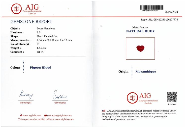 A loose heart shape Natural Ruby of 1.44ct. With AIG report #GEM20240126107779. Origin: Mozambique. (As new)