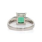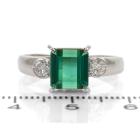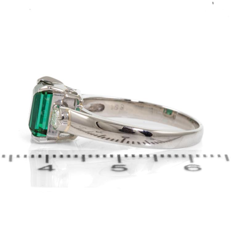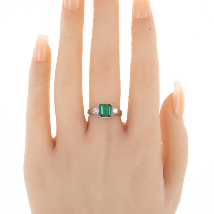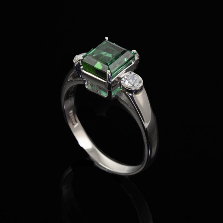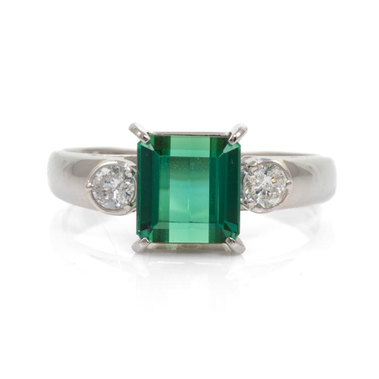 Tourmaline and Diamond ring with Emerald cut Natural Green Tourmaline of 1.50ct and 2 round Natural Diamonds totalling 0.21cts. Platinum 900. Ring size N. Band width: 3.4mm - 2.0mm. Weight: 5.1g. (Pre-owned)