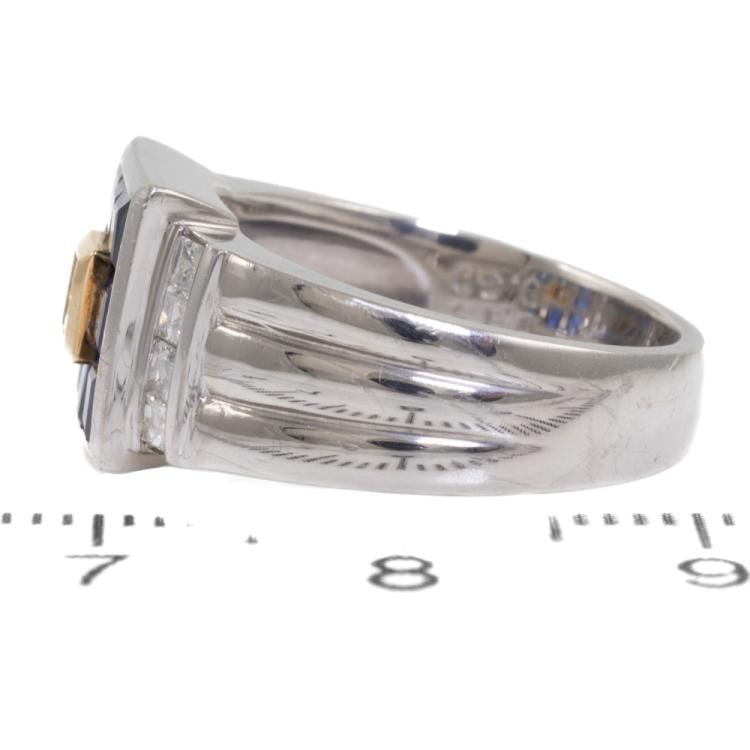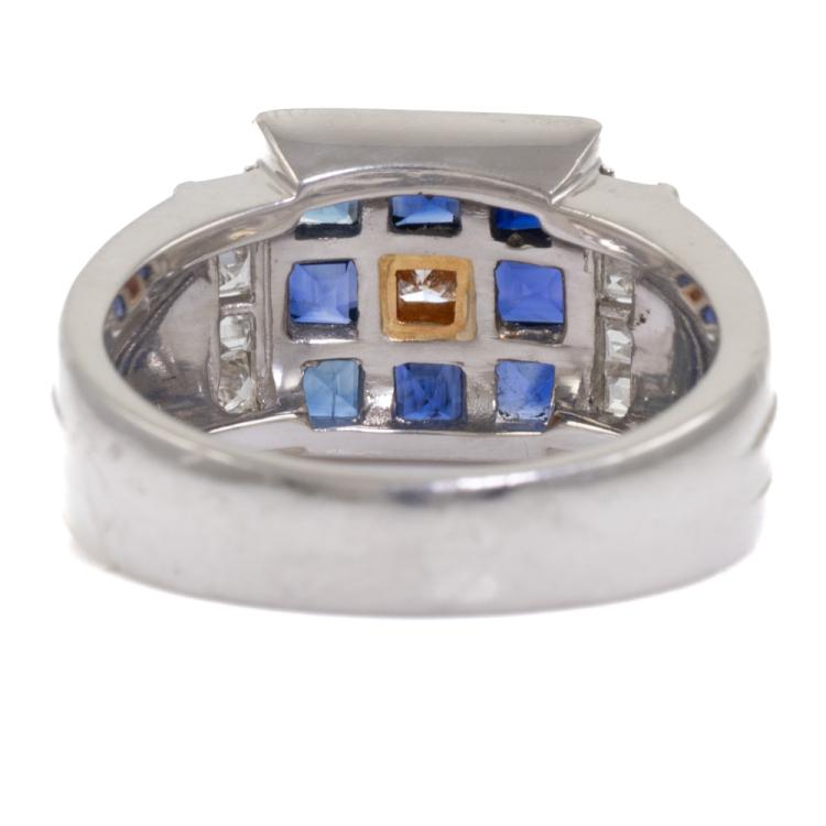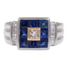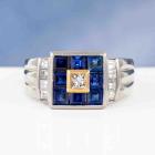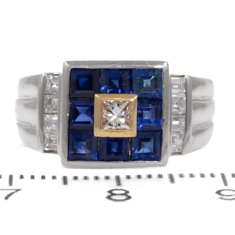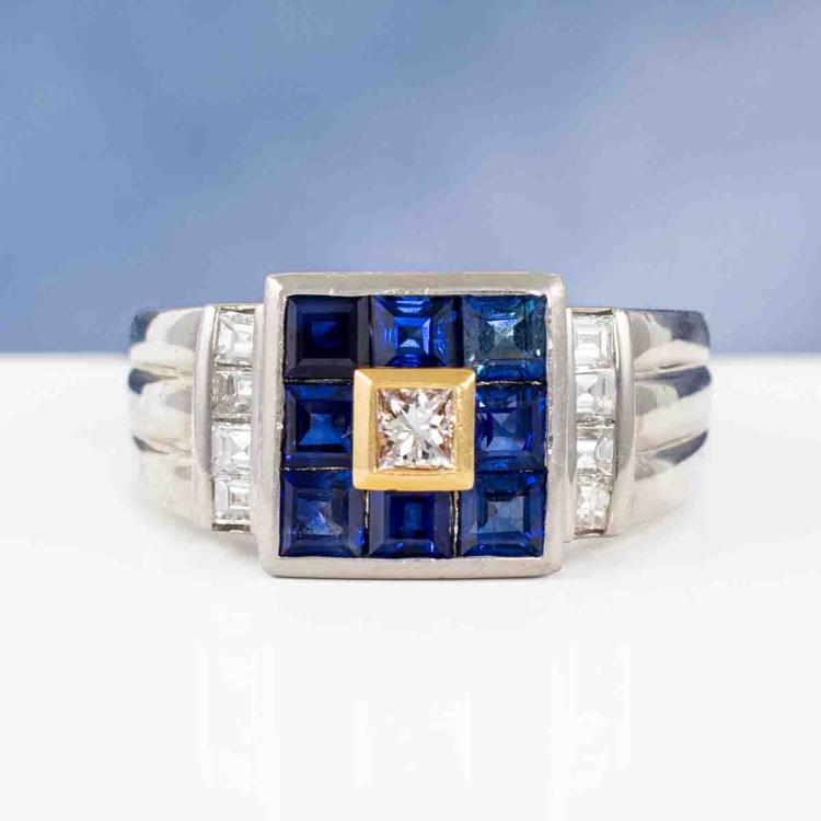 Sapphire and Diamond ring with princess cut natural blue Sapphires totalling 1.56ct and princess cut natural Diamonds totalling 0.43ct (Estimated grading: H SI) . 18ct yellow gold and Platinum 900. Ring size L1/2. Weight: 11.0g (Pre-owned)