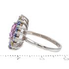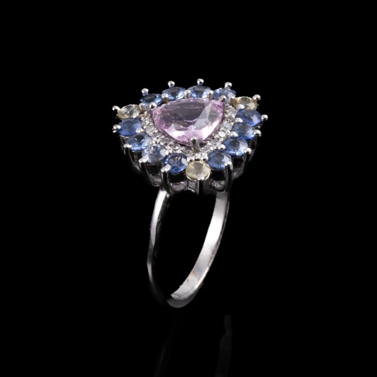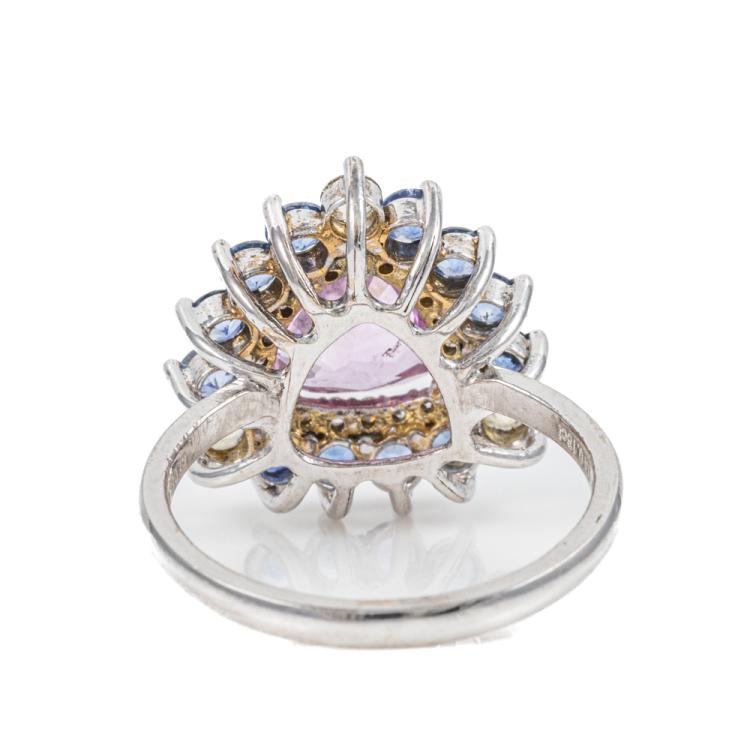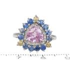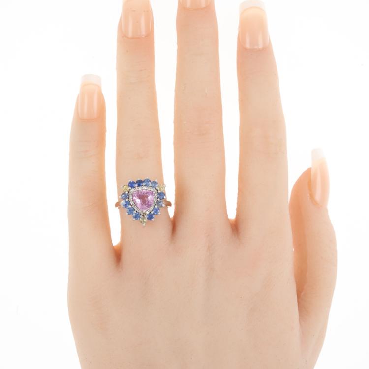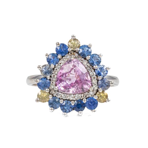 Sapphire and Diamond ring with a centre trilliant cut unheated Ceylon slightly orangish pink Natural Padparadscha Sapphire of 1.61ct, round blue & yellow Natural Sapphires totalling 1.18cts (only one blue Sapphire tested) and round Natural Diamonds totalling 0.18cts. 18ct white gold - XRF tested, stamped 14ct. Ring size L. Band width: 1.8mm. Weight: 3.9g. With GGTL Report #206172. (As new)