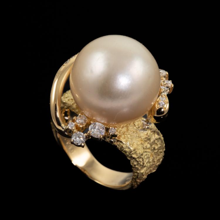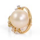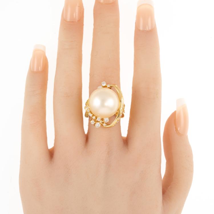 Pearl and Diamond ring with light champagne South Sea Pearl of 16.2mm and round Natural Diamonds totalling 0.62cts (Estimated grading: G-H SI). 18ct yellow gold. Ring size M1/2. Band width: 4.4mm x 7mm. Weight: 18.8g. With Certificate #418434. (Pre-owned)