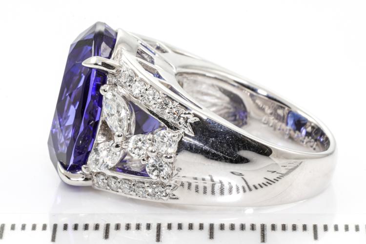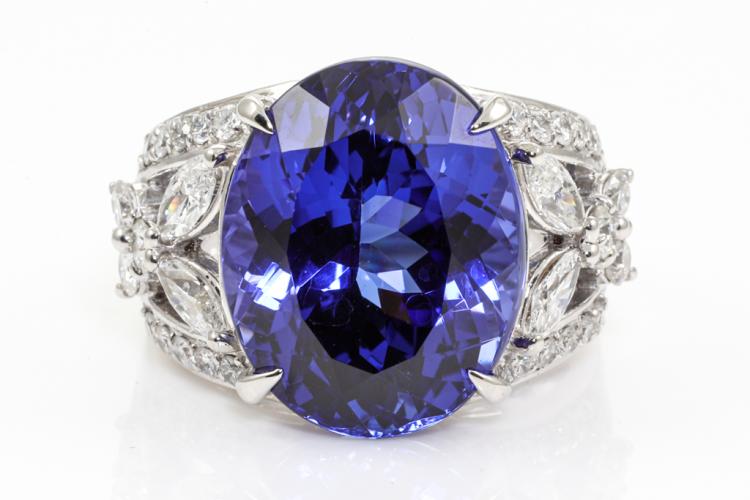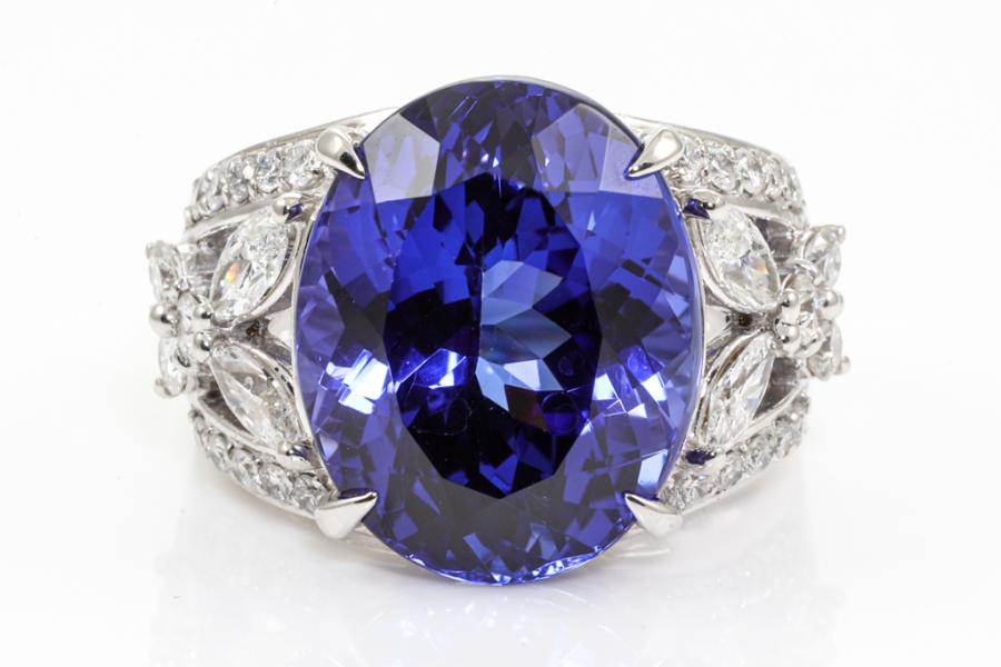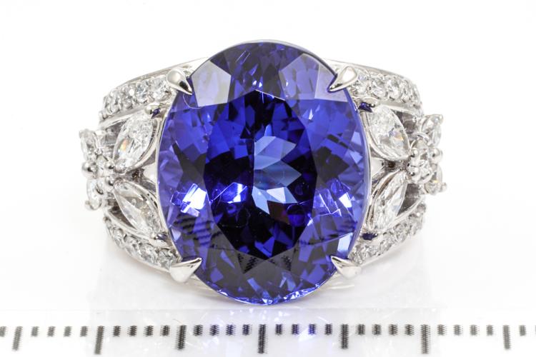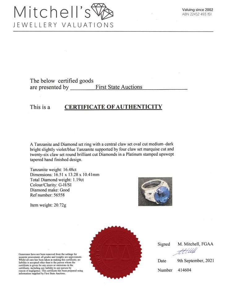 Tanzanite and Diamond ring with an oval natural Tanzanite of 16.48ct and round & marquise cut natural Diamonds totalling 1.19ct (Estimated grading: G-H SI). Platinum - 900. Ring size L. Weight: 20.7g. With Certificate #414604. (Pre-owned)