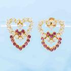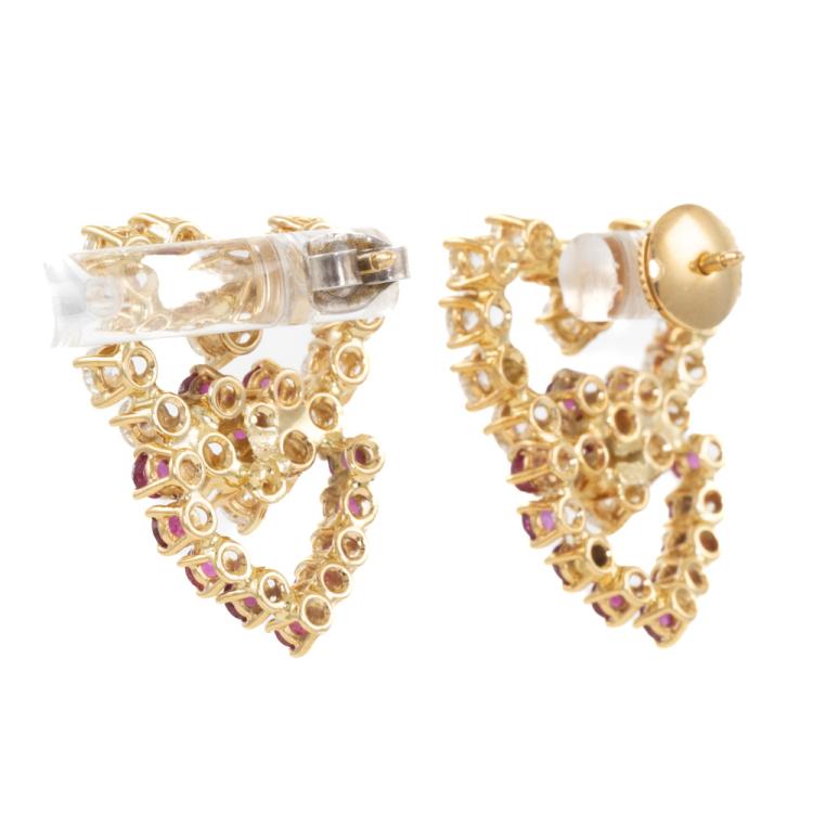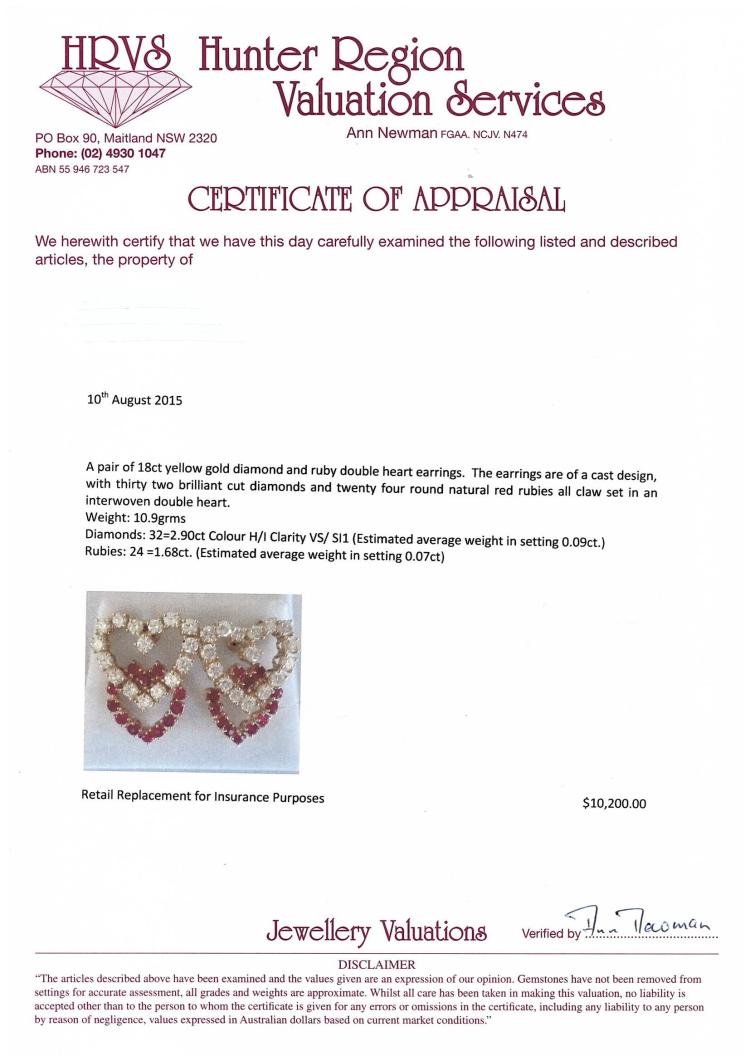 Double heart design earrings with round natural Rubies totalling 1.68ct and round natural Diamonds totalling 2.90ct (Estimated grading: H-I VS-SI). 18ct yellow gold. Note backs don’t match, one is 18ct yellow gold and one is silver. Weight: 10.9g. With Appraisal dated 10/08/15. (New)