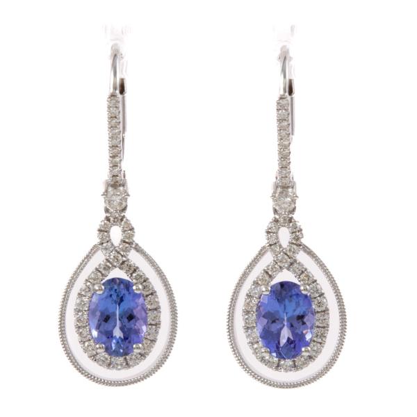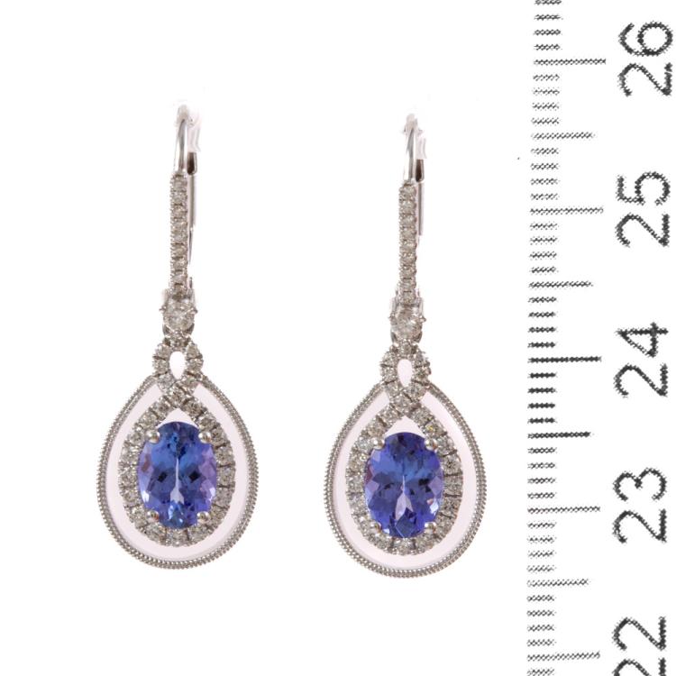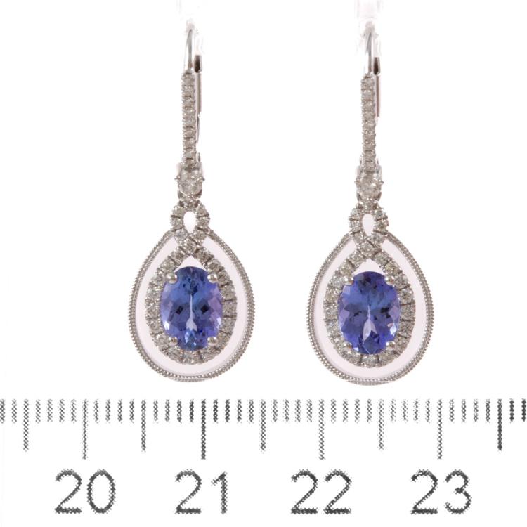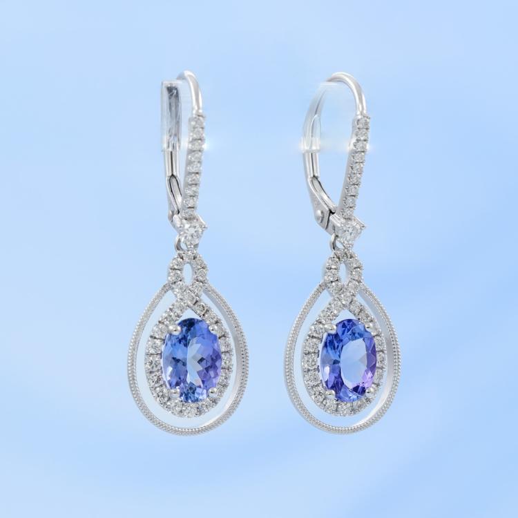 Tanzanite and Diamond lever back earrings with oval shape Natural Tanzanite totalling 1.69ct and round Natural Diamonds totalling 0.49ct (Estimated grading: H SI). 18ct white gold. Weight: 3.7g. (New)