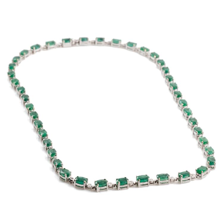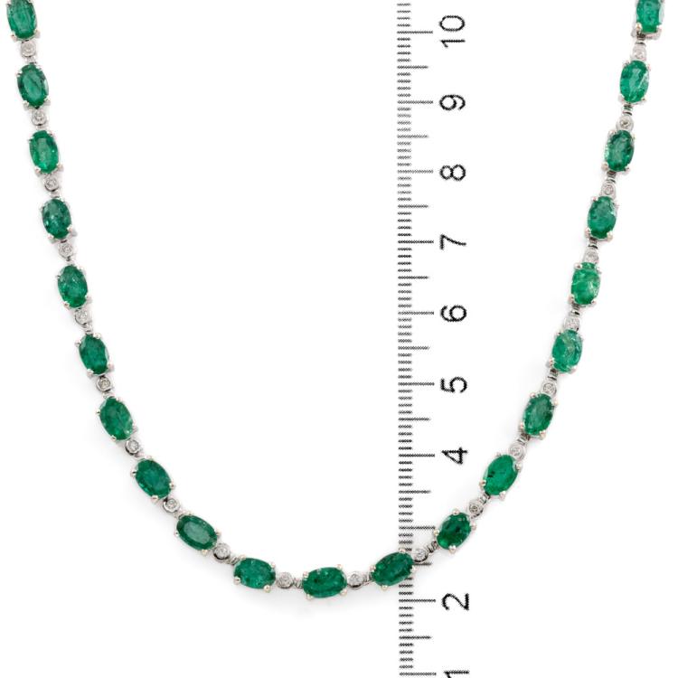 Emerald and Diamond necklace with oval shape Natural Emerald totalling 18.00cts and round Natural Diamonds totalling 0.25cts. 18ct white gold. Length: 41.5cm. Weight: 24.0g. With Certificate 418384. (Pre-owned)