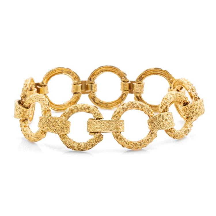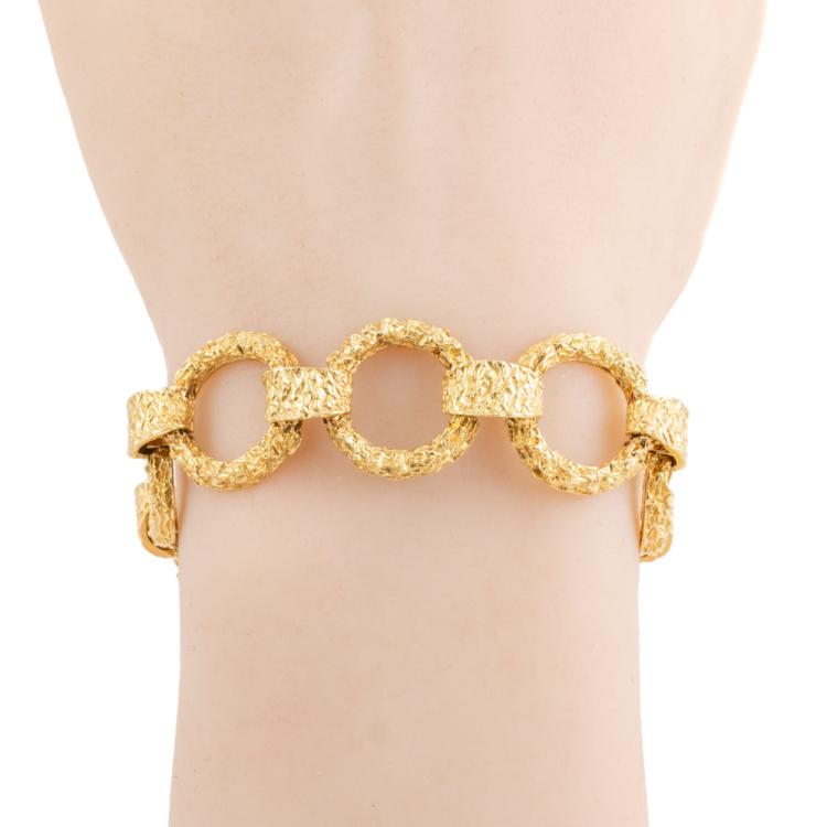 18ct yellow gold ring design bracelet. Weight: 40.4g. Length: 19cm. Width: 1.8cm. (Pre-owned)