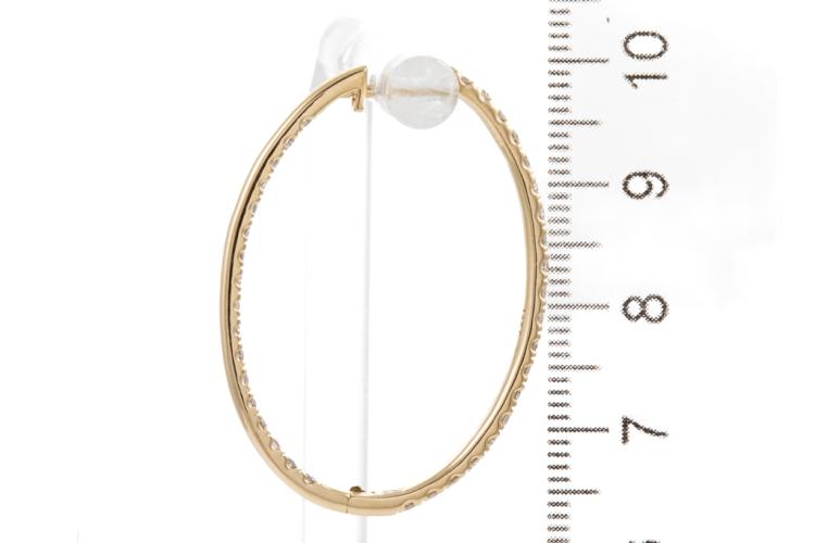 Diamond hoop earrings with 74 round Natural Diamonds totalling 1.98cts (Estimated grading: H SI). Back of the hoop has the Diamonds set inside the hoop. 14ct yellow gold. Width: 25.0mm. Length: 35.0mm. Weight: 6.4g. (New).