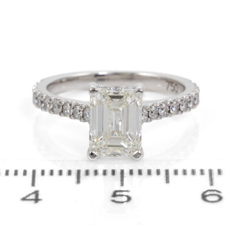 Diamond ring with an emerald cut Natural Diamond of 2.02ct (with GIA Report graded as J VS1 #522146772) and remaining round Natural Diamonds totalling 0.43cts. 18ct white gold. Ring size K1/2. Band width: 2.1mm. Weight: 3.9g. With Valuation dated 29/06/22. (Pre-owned)