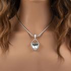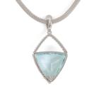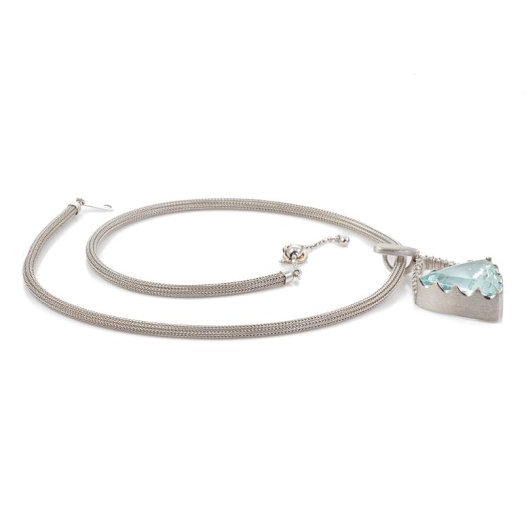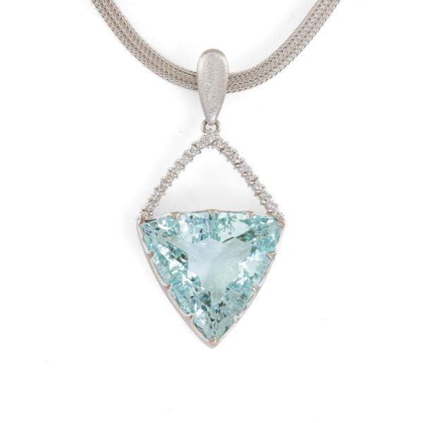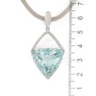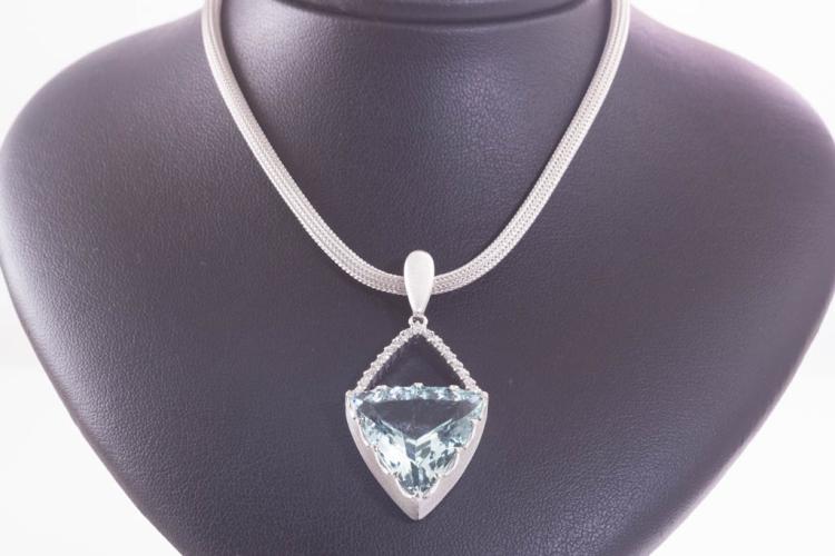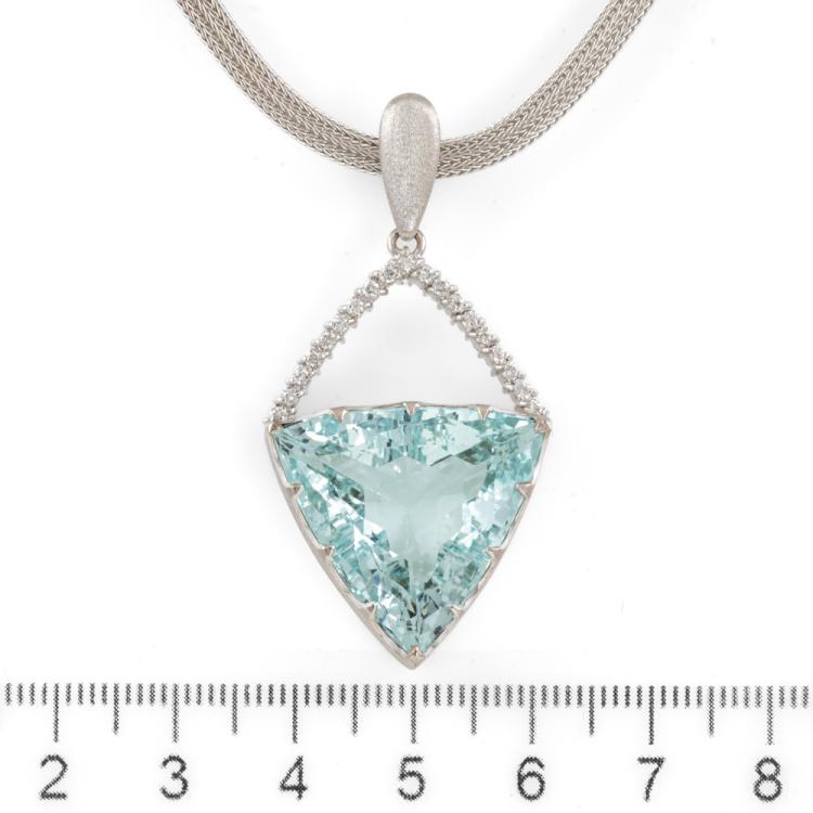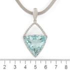 Aquamarine and Diamond pendant with trilliant cut Natural Aquamarine of 20.40ct and round Natural Diamonds totalling 0.30cts (Estimated grading: H-I SI) 18ct white gold with 44cm 18ct white gold adjustable mesh chain. Weight: 28.5g. With certificate #416733. (Pre-owned)