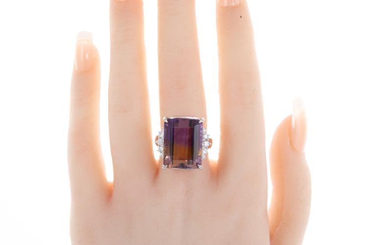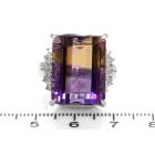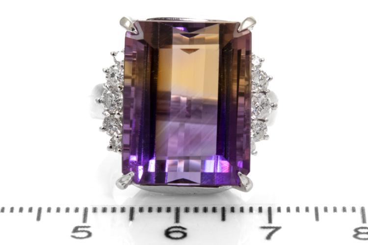 Ametrine and Diamond ring with emerald cut Natural Ametrine of 20.62ct and round Natural Diamonds totalling 0.53cts (Estimated grading: H SI-P2). Platinum - 900. Ring size L. Weight: 19.1g. (Pre-owned)