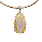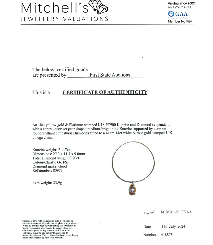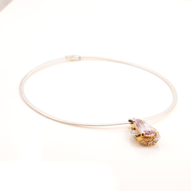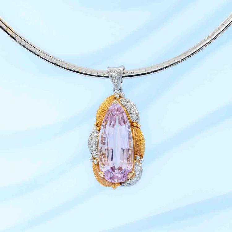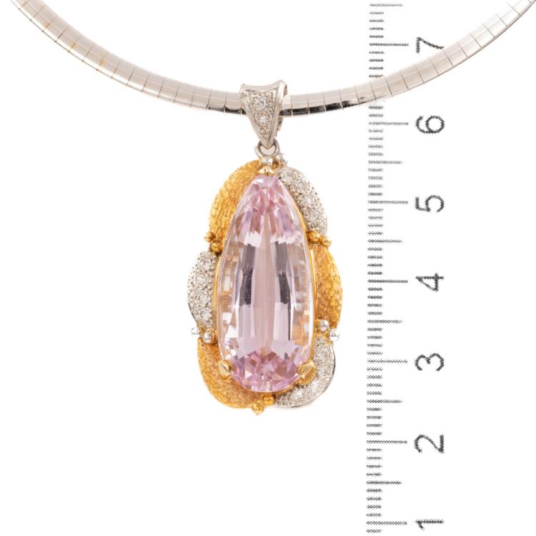 Kunzite and Diamond pendant with pear shape Natural Kunzite of 21.17ct and round Natural Diamonds totalling 0.20ct. 18ct yellow gold & platinum 900 with 41cm 14ct rose & white gold reversible Omega chain. Weight: 33.9g. With Certificate #418878. (Pre-owned)