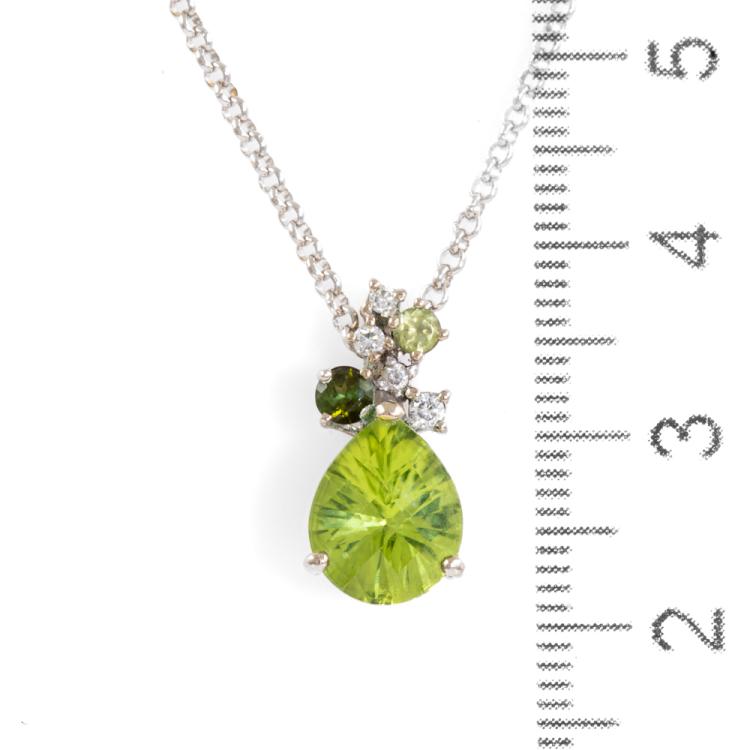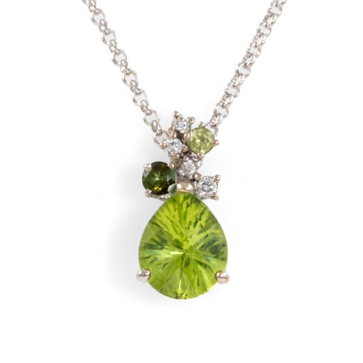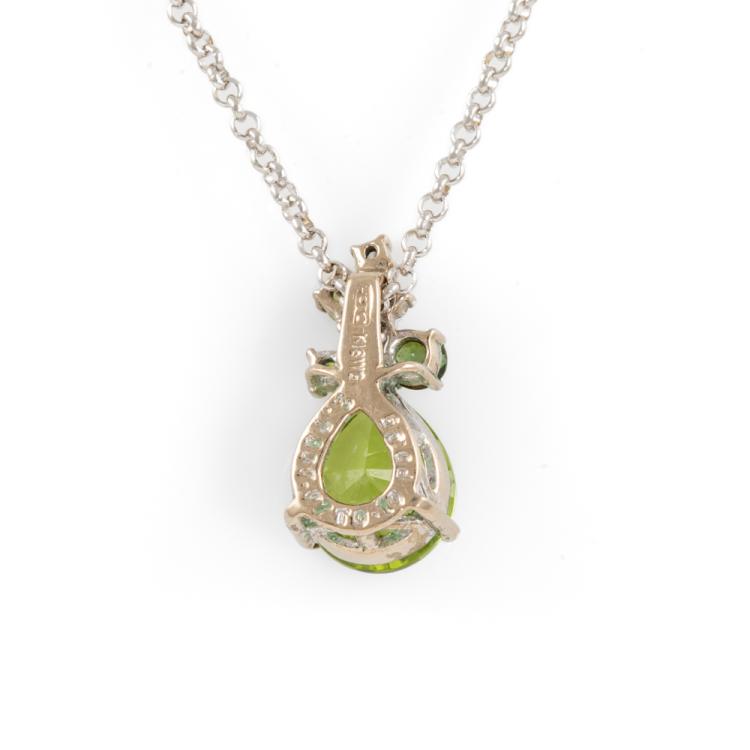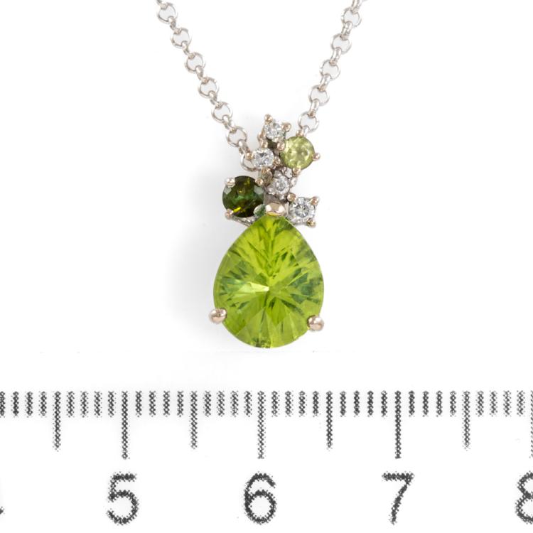 Peridot, Tourmaline and Diamond pendant with pear shape Natural Peridot of 2.19ct, round green Natural Tourmaline of 0.10ct, round Natural Peridot of 0.05ct and round Natural Diamonds totalling 0.07ct. 18ct white gold with adjustable 18ct white gold 45cm chain. Weight: 6.1g. (Pre-owned)