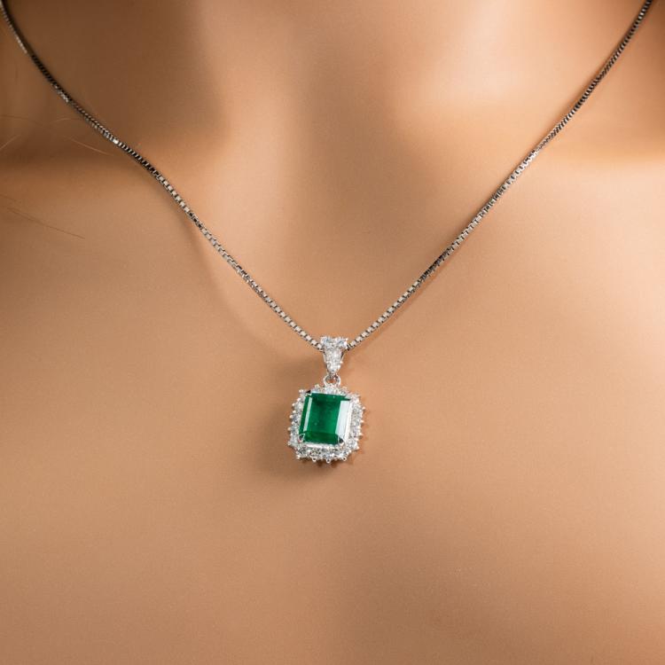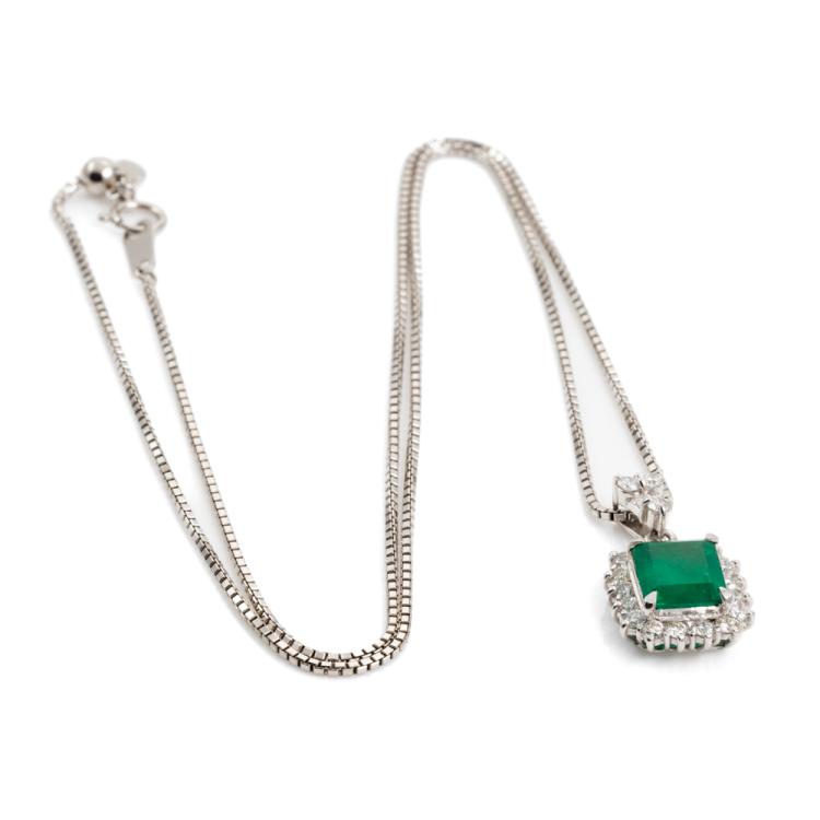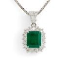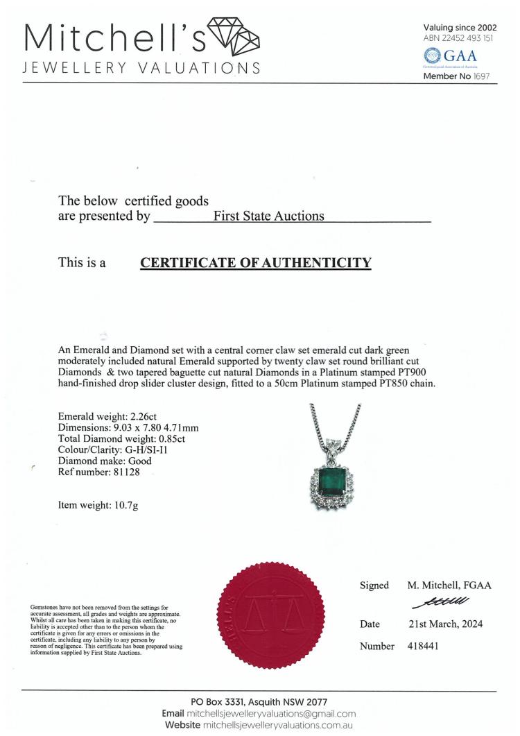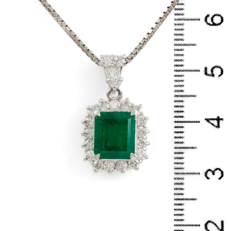 Emerald and Diamond pendant with Natural Emerald of 2.26ct and round & baguette cut Natural Diamonds totalling 0.85ct (Estimated grading: G-H SI-P1). Platinum 900 with 50cm platinum 850 adjustable chain. Weight: 10.7g. With Certificate 418441. (Pre-owned)