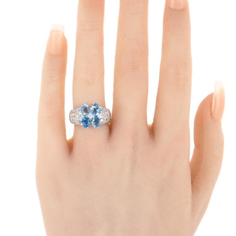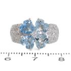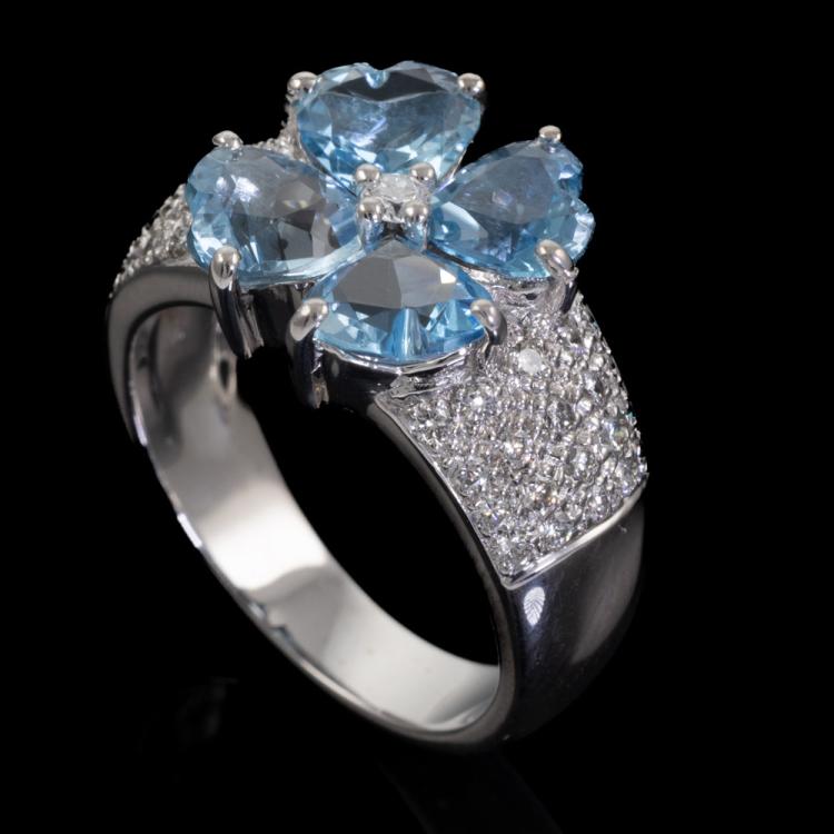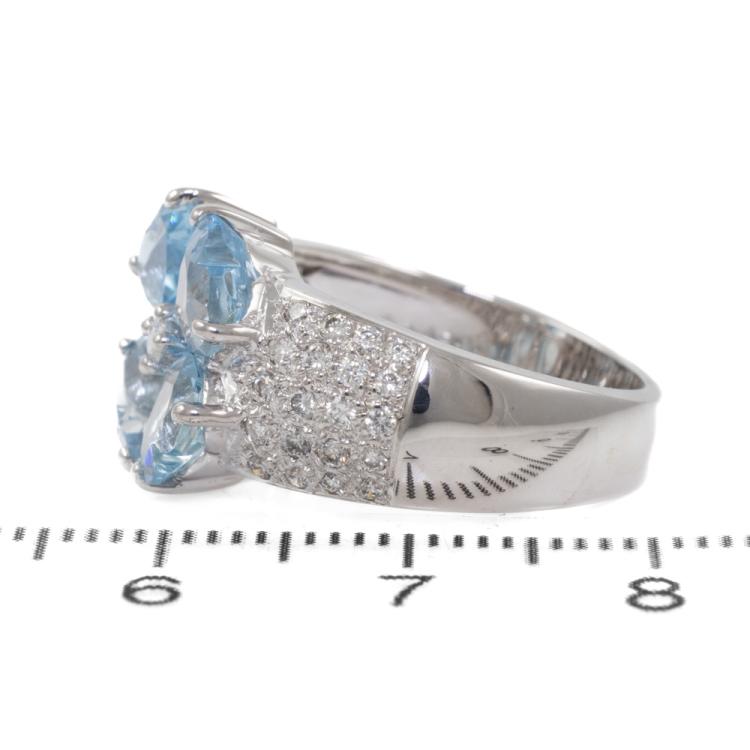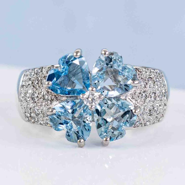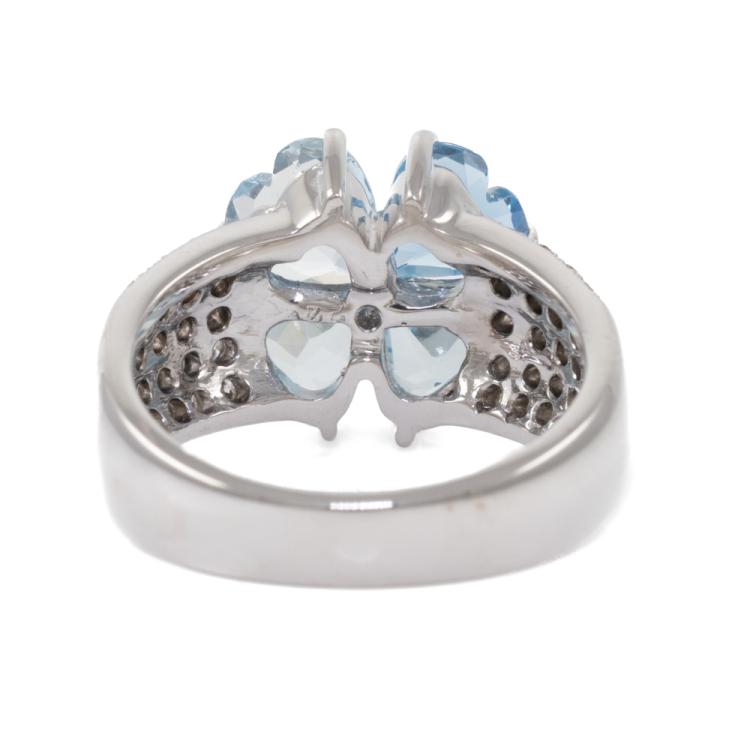 Clover designed ring with heart shape natural Aquamarine totalling 2.34ct and round natural Diamonds totalling 0.49ct (Estimated Grading: G VS). 18ct white gold. Ring size: L. Band width: 3.8mm - 7.2mm. Weight: 9.1g. (Pre-owned)