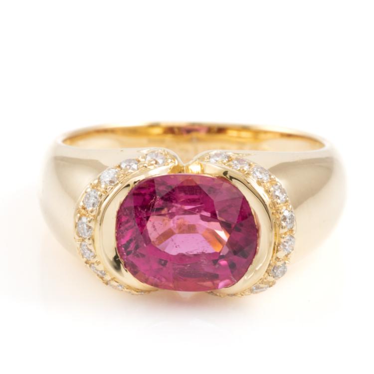 Rubellite and Diamond ring with oval Natural Rubellite of 2.53cts and round Natural Diamonds totalling 0.21cts. 18ct yellow gold. Ring size L. Band width: 5.2mm - 3.1mm. Weight: 7.2g. (Pre-owned)