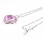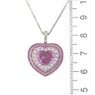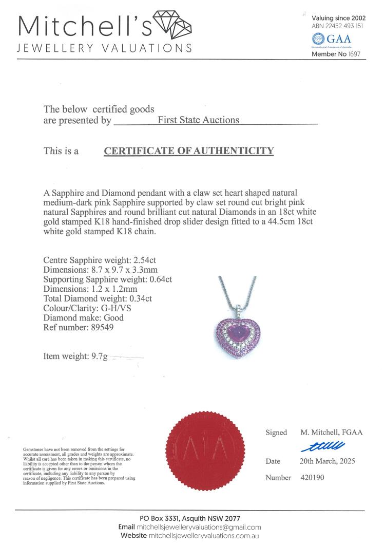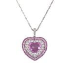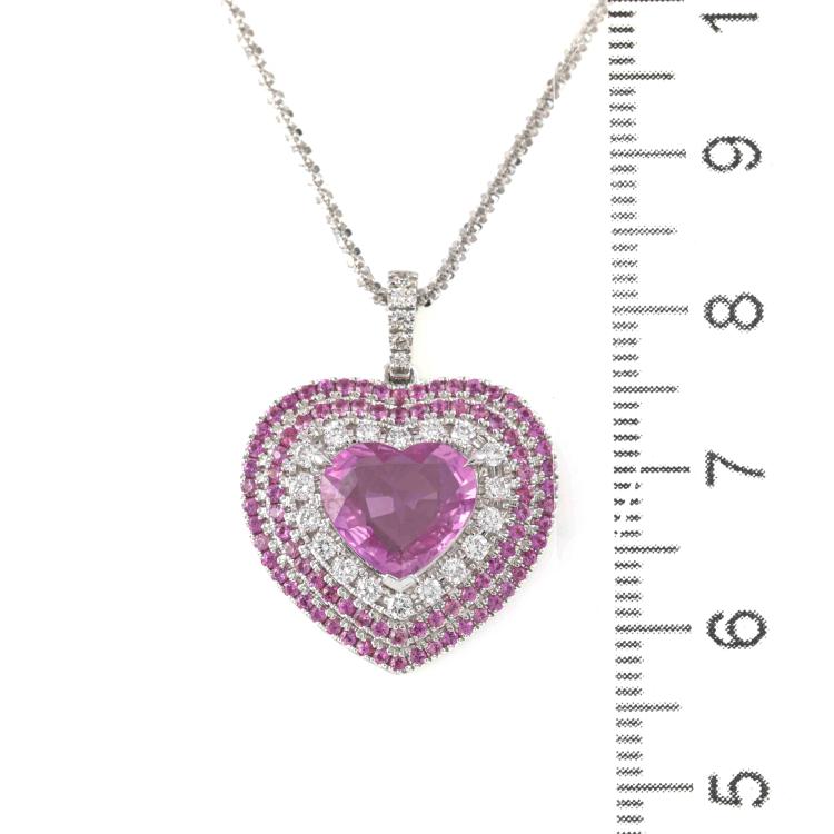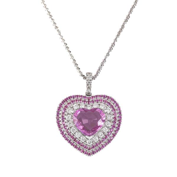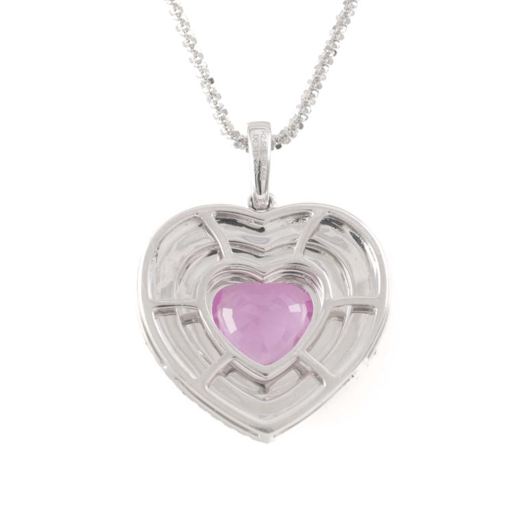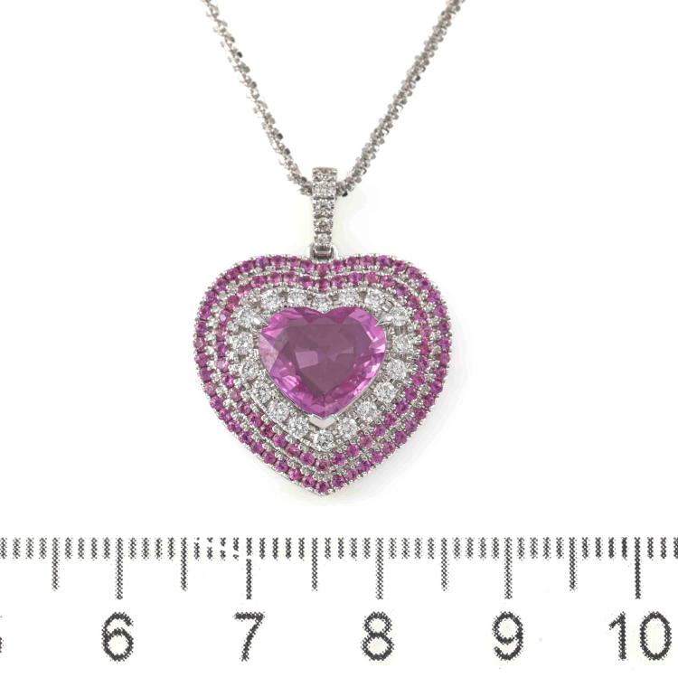 Sapphire and Diamond pendant with centre heart shape Natural Pink Sapphire of 2.54ct, surrounding round Natural Pink Sapphires totalling 0.64ct and round Natural Diamonds totalling 0.34ct (Estimated grading: G-H VS). 18ct white gold with 18ct white gold 44.5cm adjustable chain. Weight: 9.7g. With Certificate #420190. (Pre-owned)