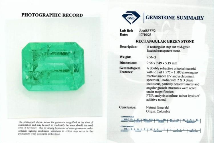 A loose emerald cut Natural Colombian Emerald of 2.56ct with GSL report #AA68377/2. (Pre-owned)