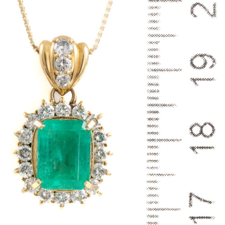 Emerald and Diamond pendant with emerald cut Natural Emerald of 2.60ct and round Natural Diamonds totalling 0.91cts (Estimated grading: H-I SI). 18ct yellow gold with 40cm 14ct yellow gold chain. Weight: 6.7g. With Certificate #418110. (Pre-owned)