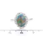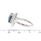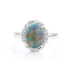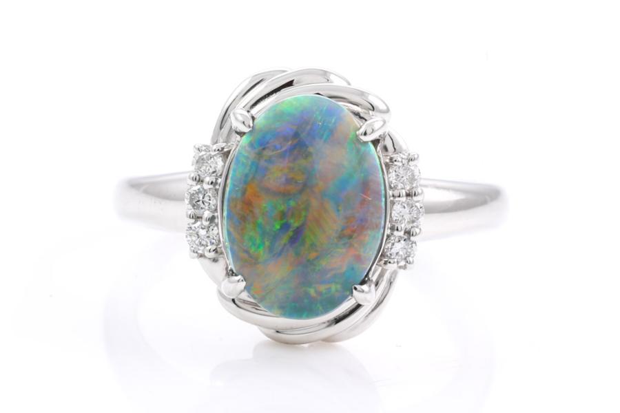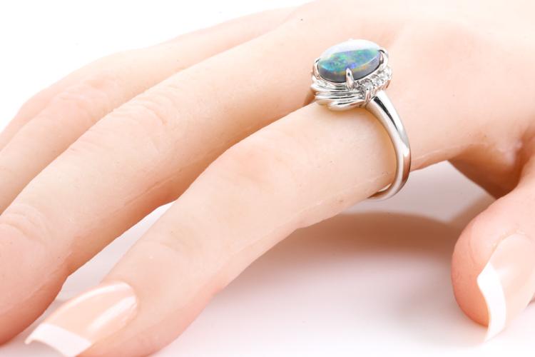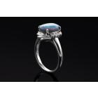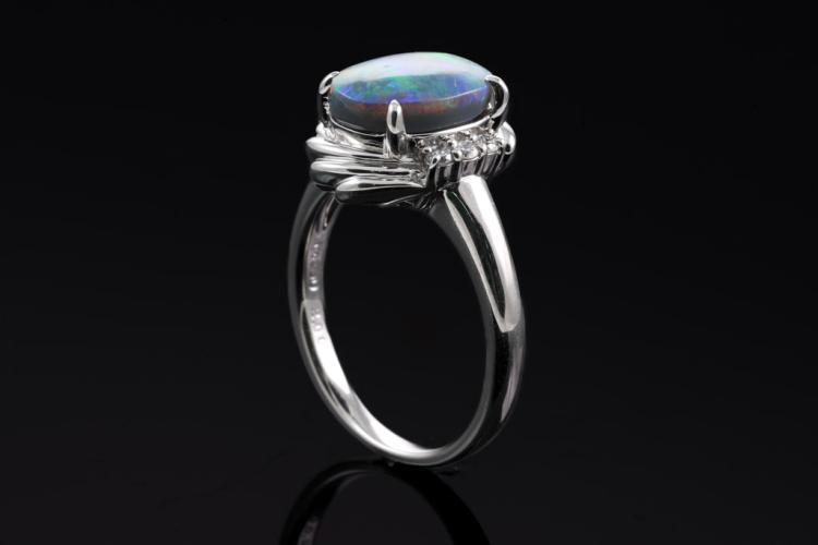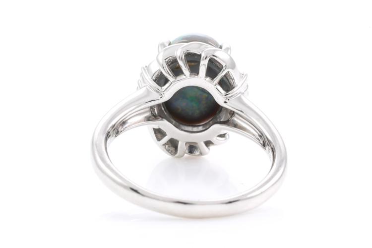 Black Opal and Diamond ring with cabochon cut solid Black Opal of 2.60ct and round Diamonds totalling 0.15cts. Platinum - 900. Ring size O. Weight: 9.1g. (Pre-owned)