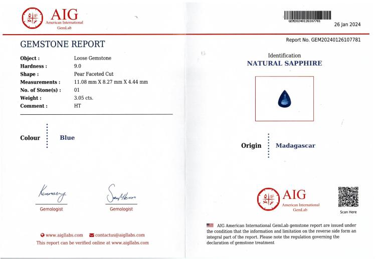 A loose pear shape blue Natural Sapphire of 3.05ct. With AIG Report #GEM20240126107781 stating origin: Madagascar. (As new)