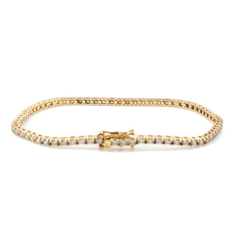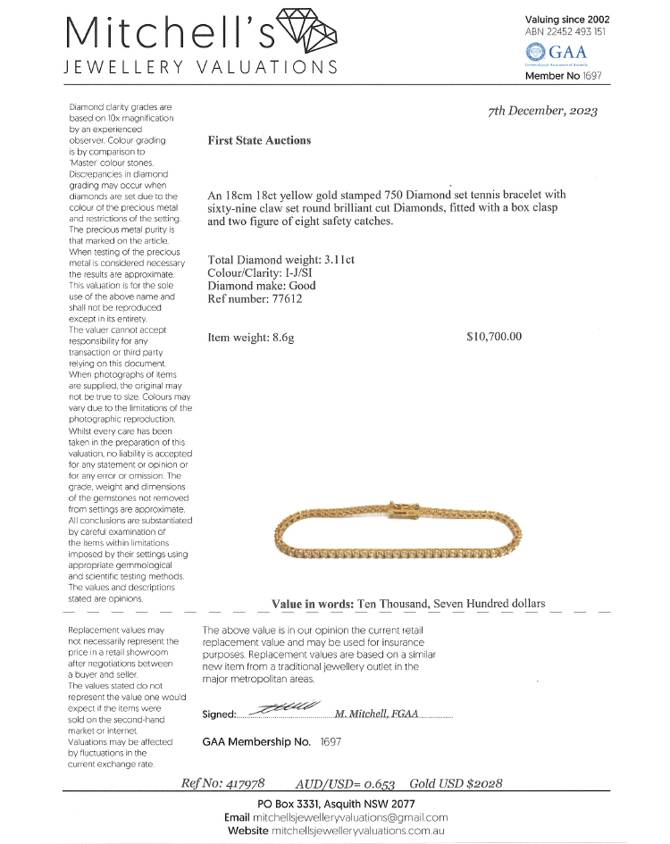 Diamond tennis bracelet with 69 round brilliant cut Natural Diamonds totalling 3.11cts. (Estimated grading: I-J SI.) 18ct yellow gold. Length: 18cm. Weight: 8.6g. With Valuation Certificate #417978. (New)